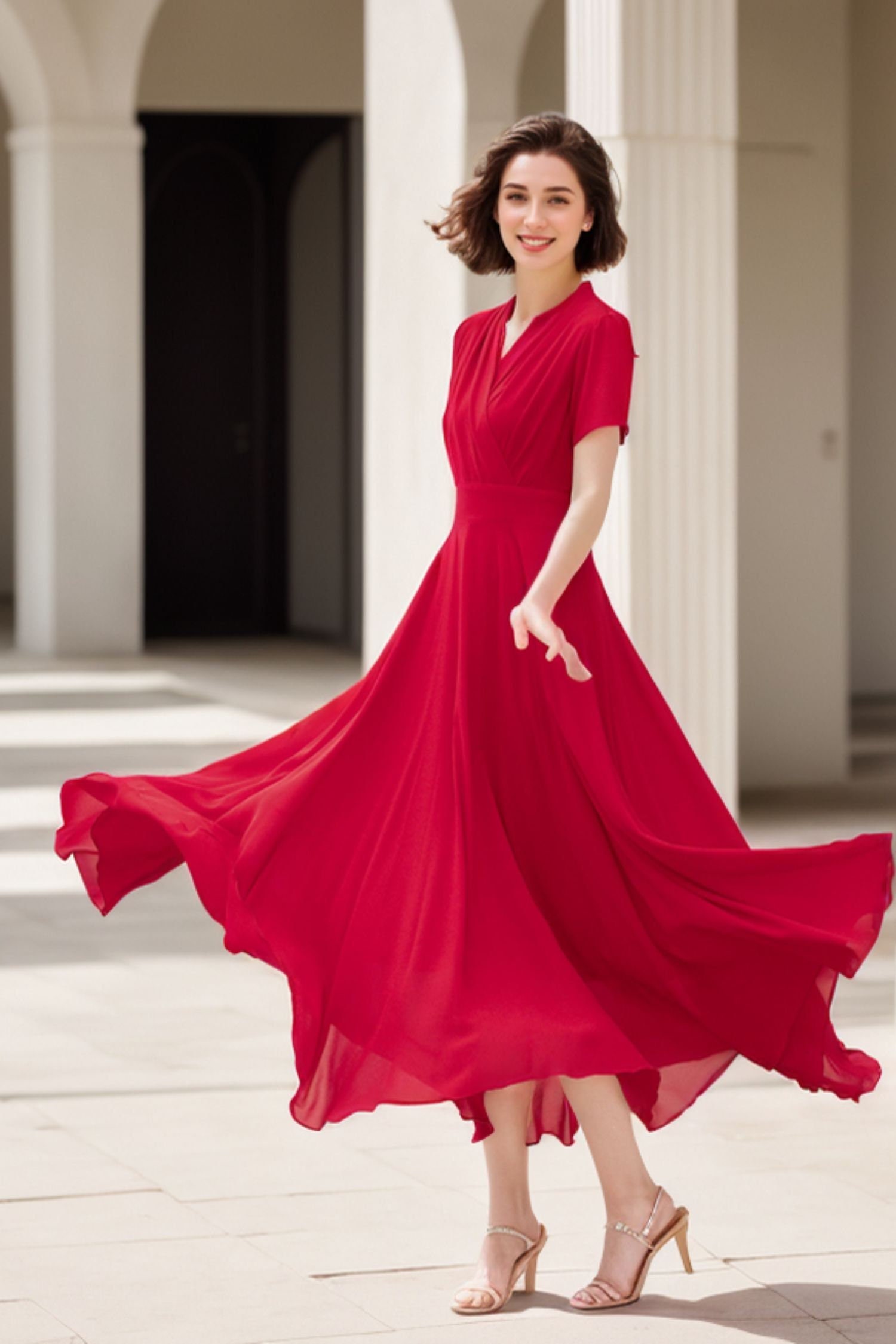Chiffon midi dress, Summer swing chiffon dress, V Neck Chiffon Dres...