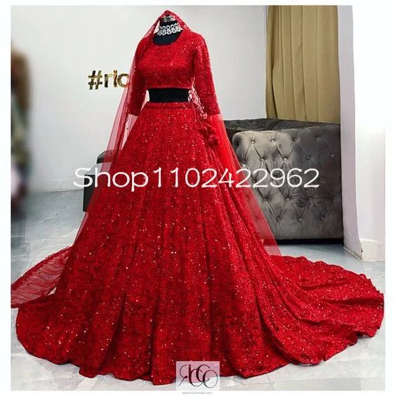 Customized Luxury Red Lehenga Choli Wedding Dresses with Veil Two Pieces Half Sleeve Lace Beaded Ind...