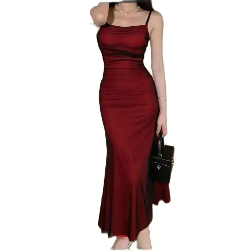 French Women's Sleeveless Bodycon Corset Maxi Dress Wine Red Spaghetti Strap Ruched Elegant Evening ...