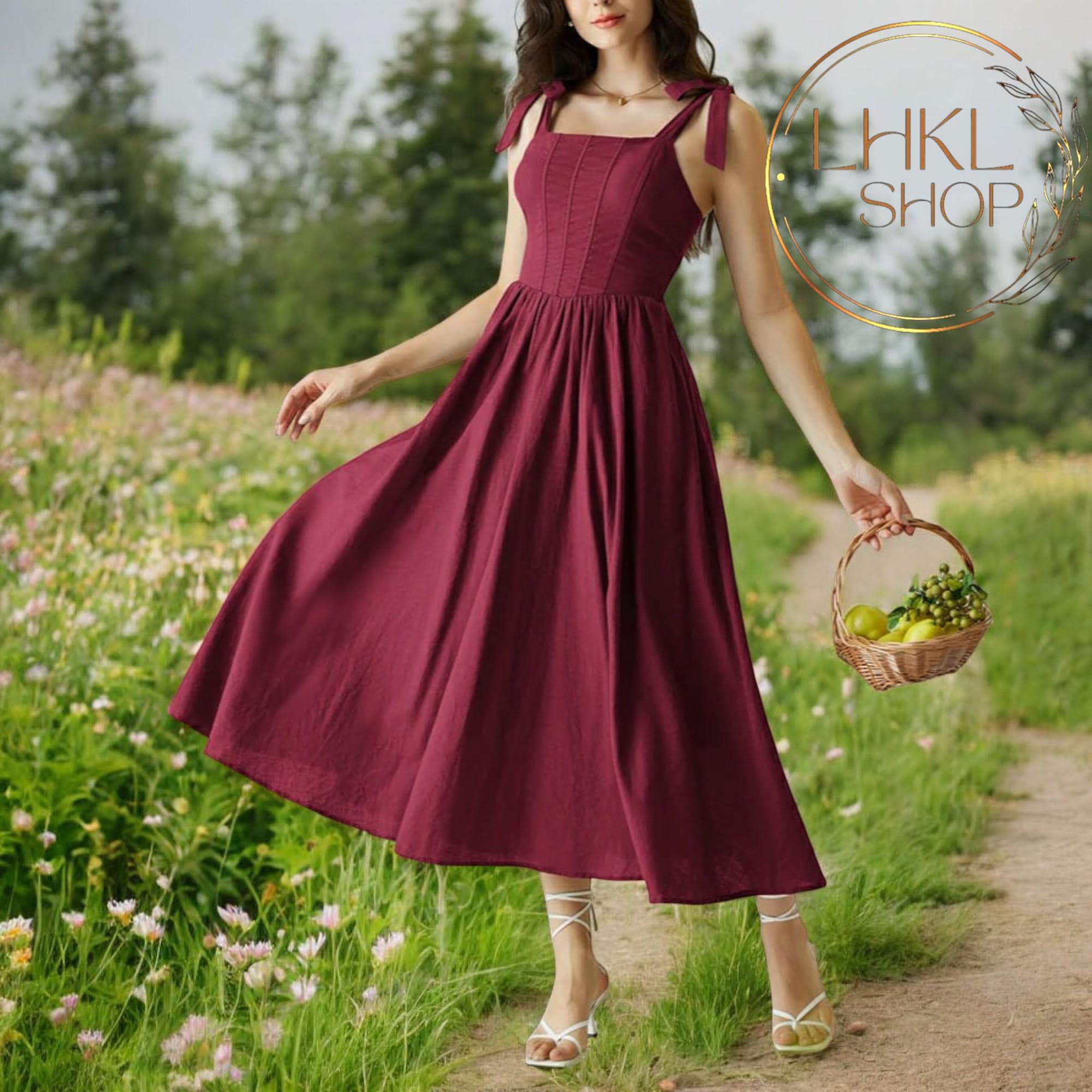 "Romantic Midi Linen Dress, Tie Dress, Fit And Flared Dress, Summer Dress, Bridesmaid Dress Lon...