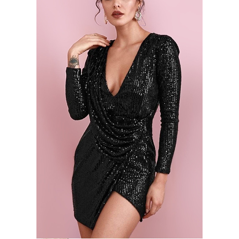 Women's Sequined Mini Dress Long Sleeve V-Neck Draped Silver Glamor...