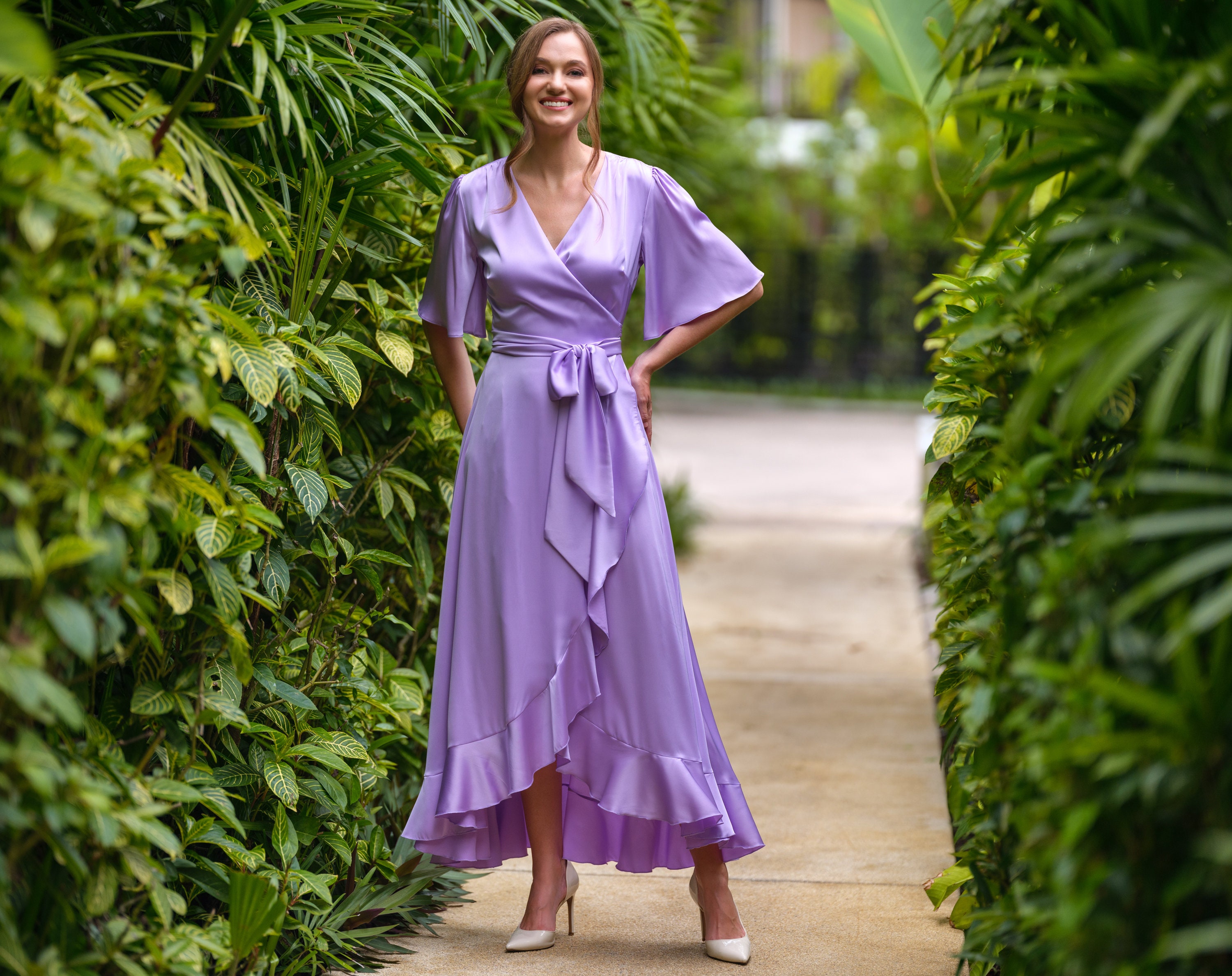 "Lilac dress, silk dress, wrap dress, bridesmaid dress, wedding guest dress, women dress, maxi ...