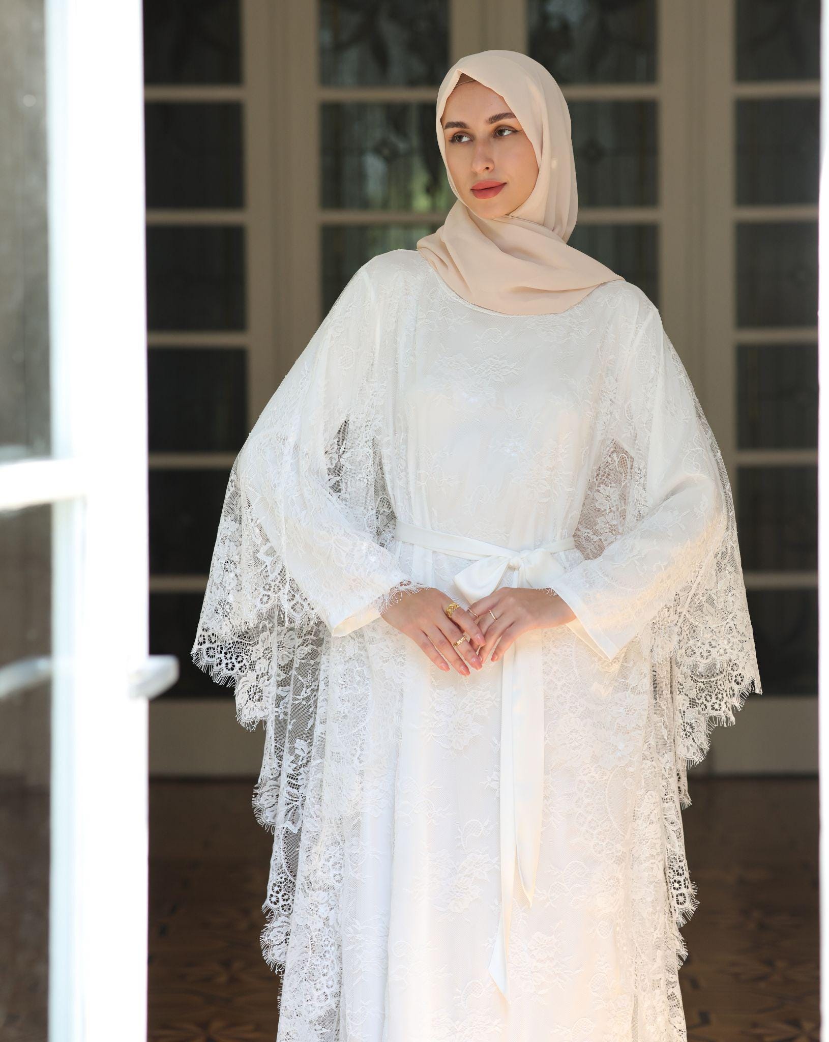 A poetic blend of delicacy and coverage, this white lace dress captures a quietly regal presence. Th...