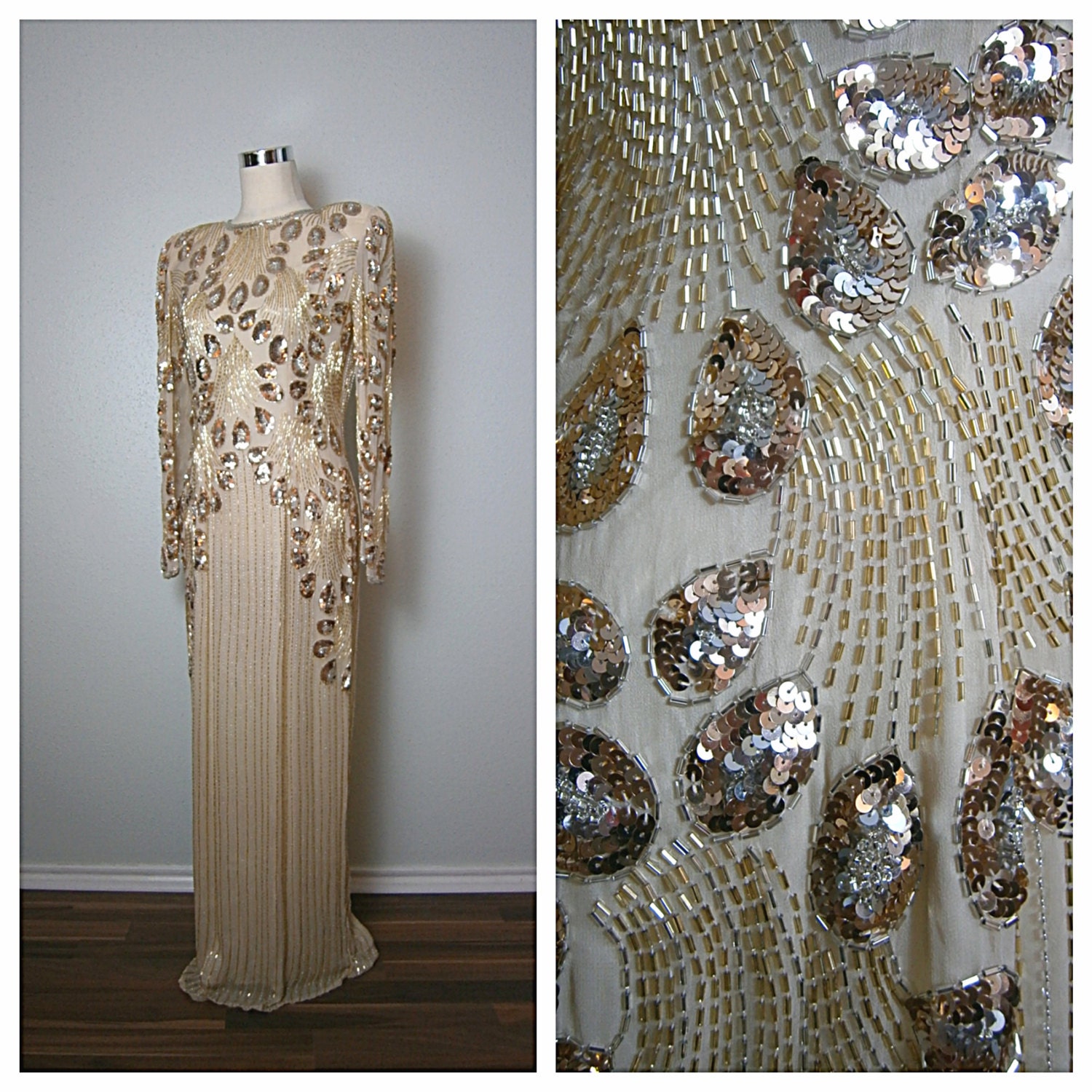 "This is an exquisite vintage dress beautifully detailed with gold and silver glass beading and...