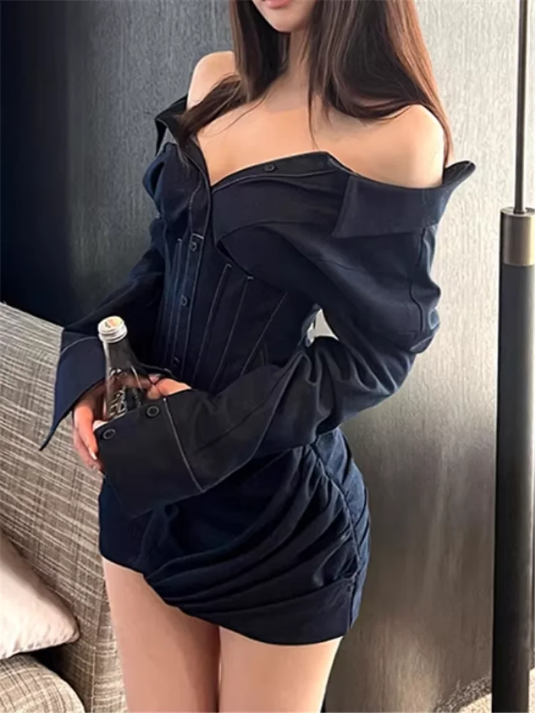 American Style Spicy Girl Sexy Mini Denim Dress Strapless Off Shoulder Long Sleeve Fishbone Slim Wai...