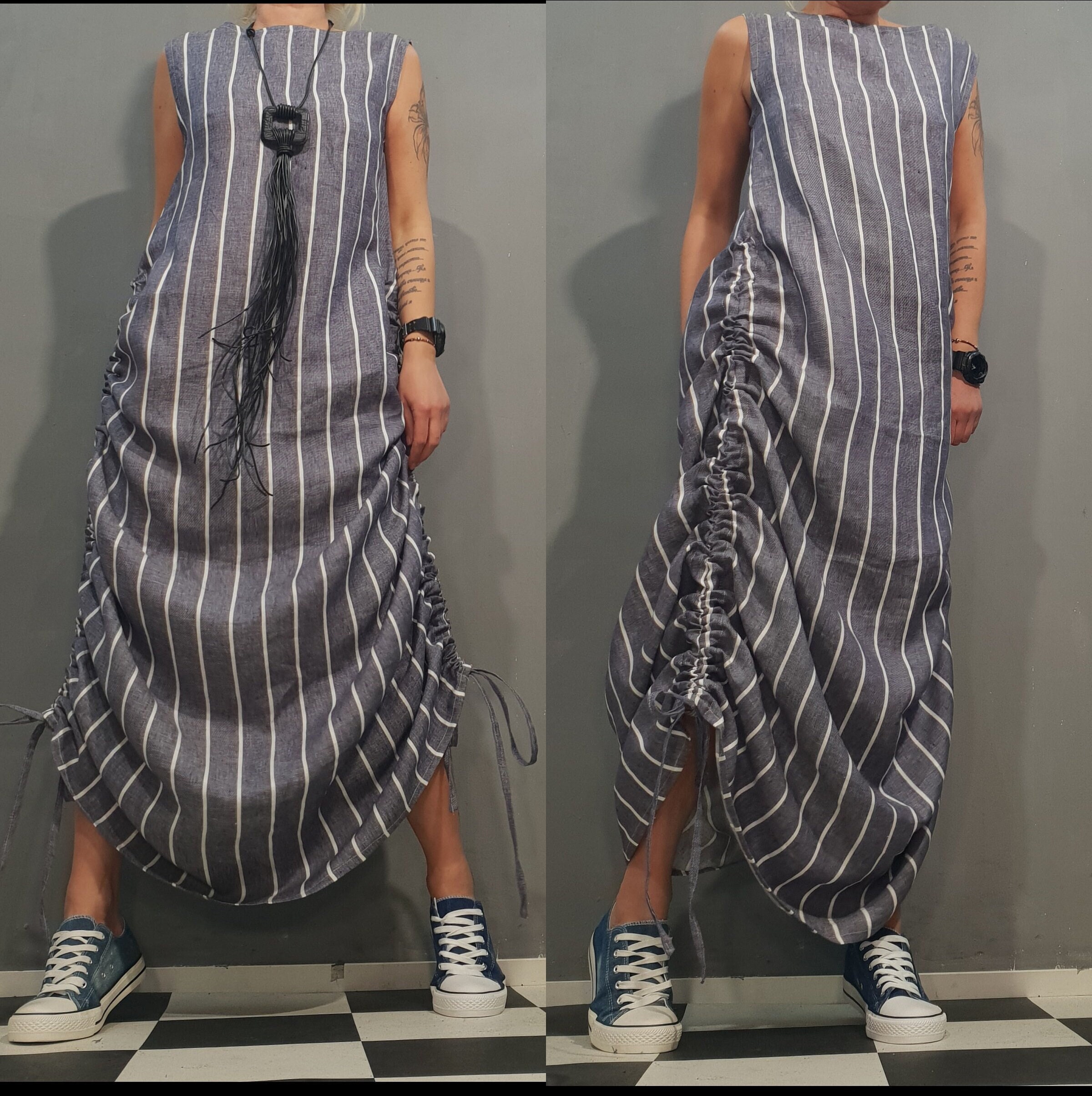 "Avant-garde elegance with this asymmetrical linen dress -- a steampunk-inspired sleeveless gow...