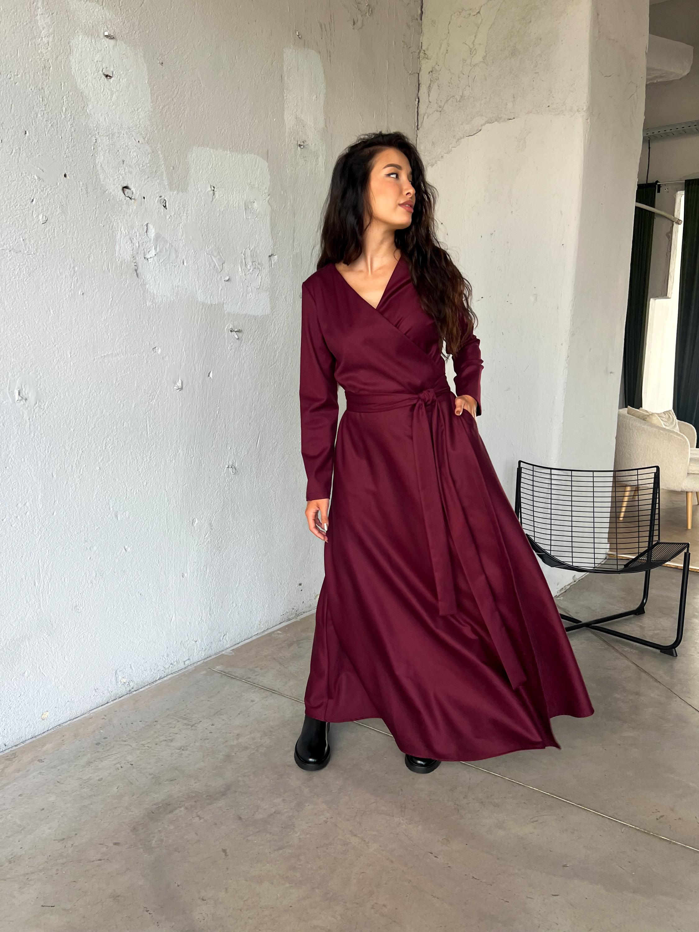Wool Maxi Dress, Wrap Winter Dress, Burgundy Medieval Dress, Long S...