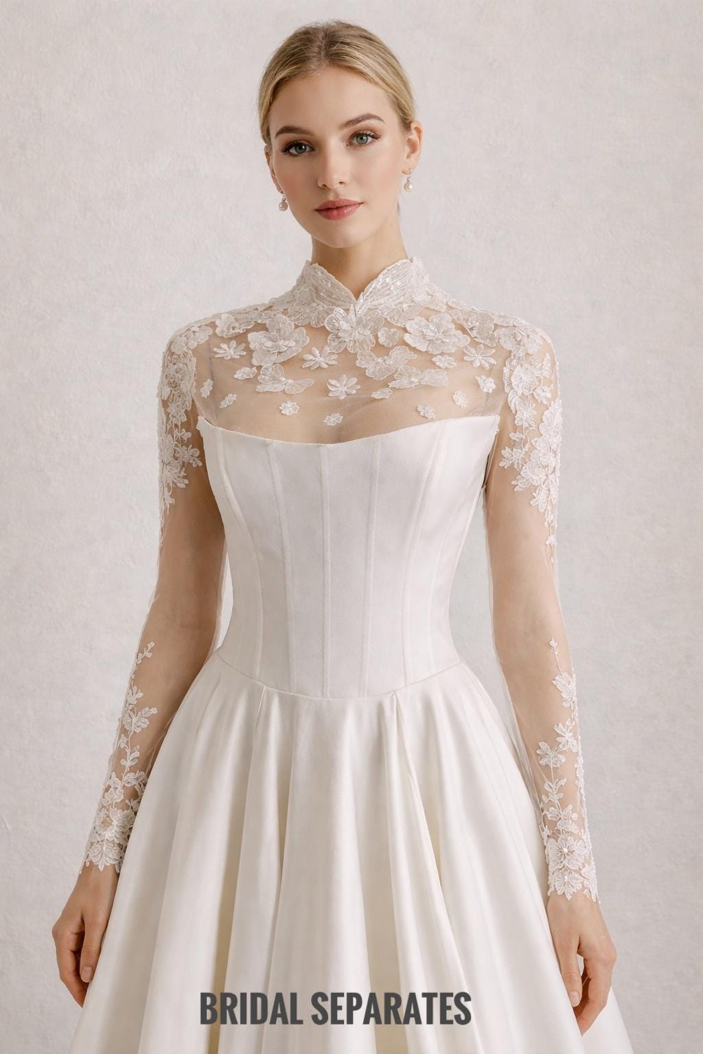 "Lace Bridal Topper High Neck Wedding Dress Cover Up - Long Sl...