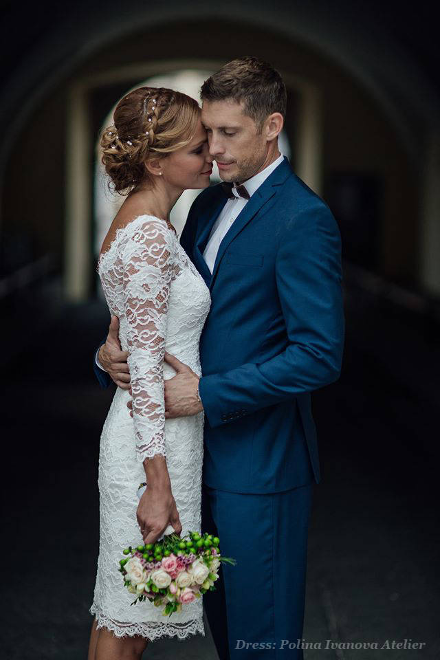 Short lace wedding dress with long sleeves and illusion aspects which would make the perfect recepti...