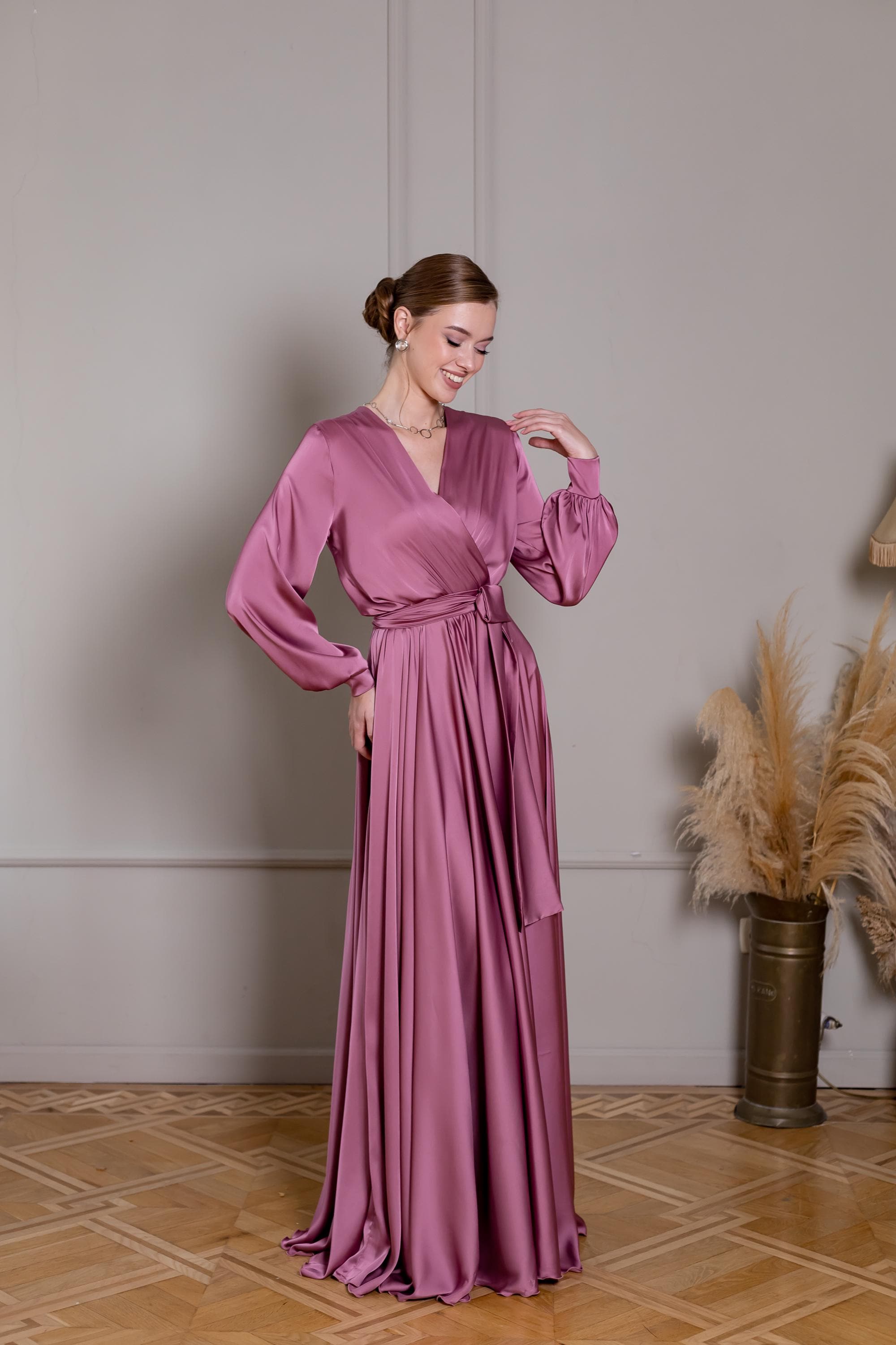"Look exquisite at any wedding or evening party in this elegant dusty pink satin dress. Made wi...