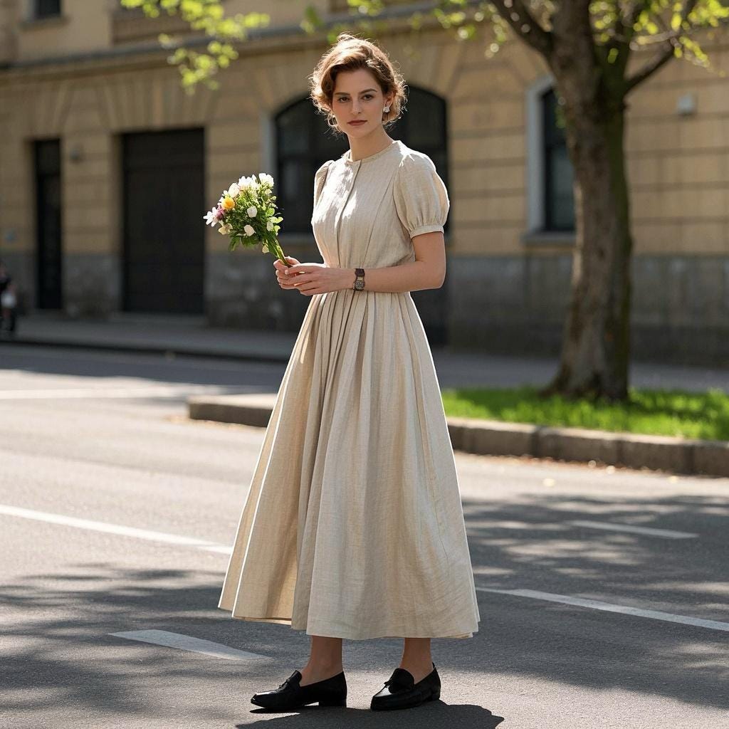 Vintage Short Puff Sleeve Linen Maxi Dress Elegant Maxi Dress Roman...