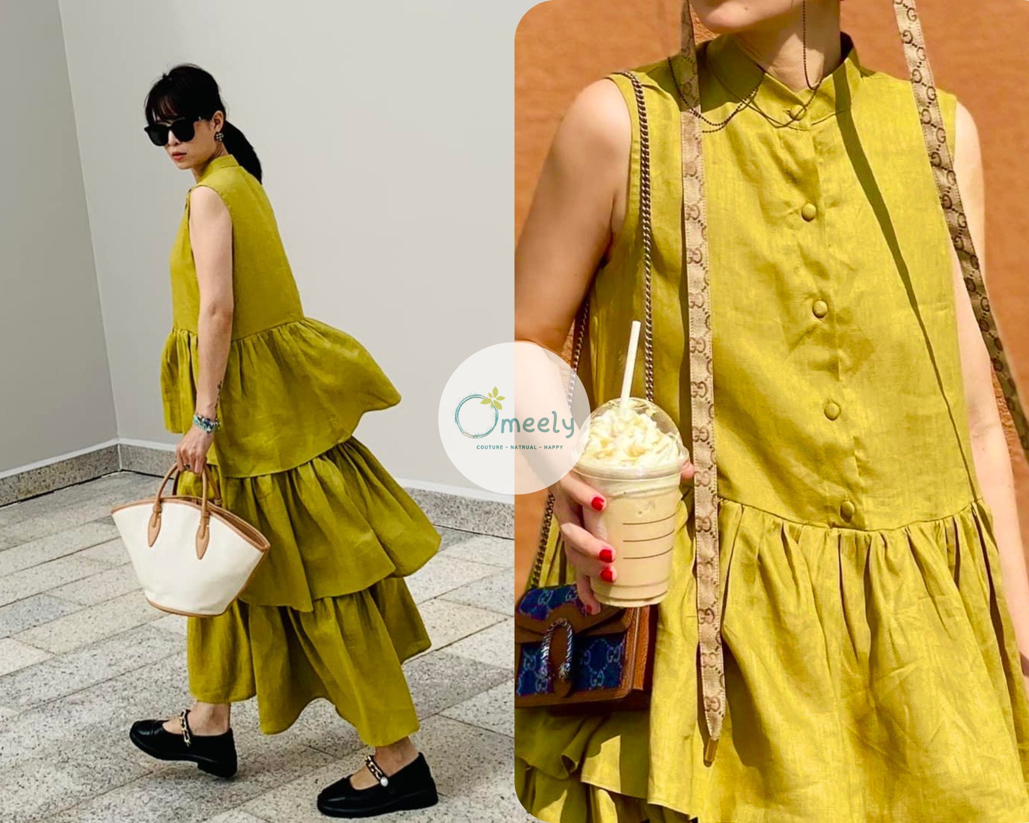 "Retro-inspired gray linen dress from Xiaolizi. The summer dress in a banded waist construction...