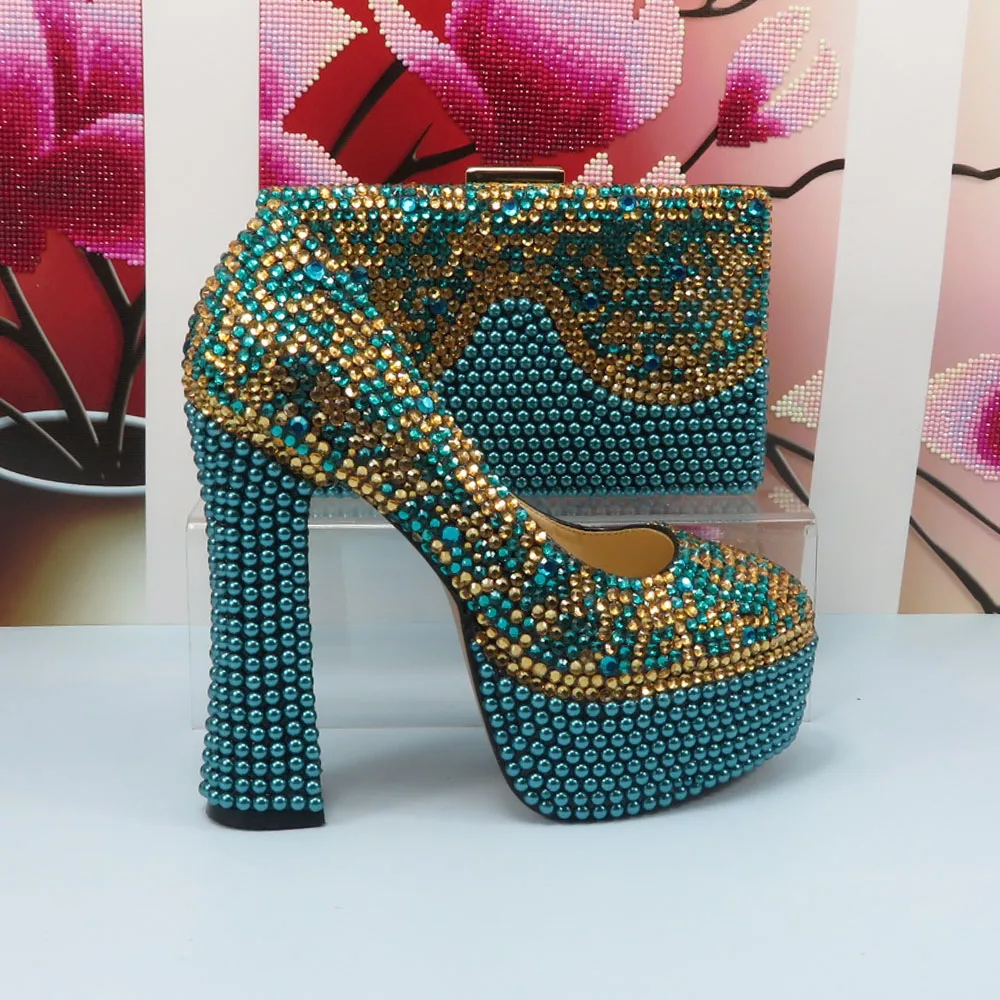 Fashion Teal Blue Mix Color Wedding Shoes and bag Set Woman 14CM High Pumps Thick Heel Party Shoes M...