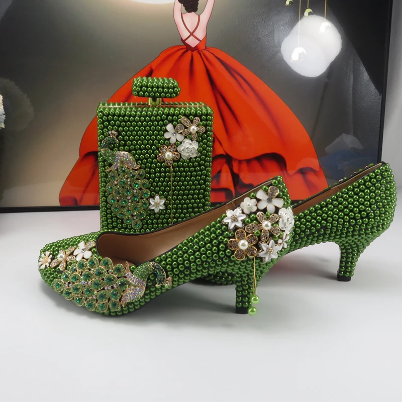 BaoYaFang Olive Green Bridal Wedding shoes and purse for Women Peac...