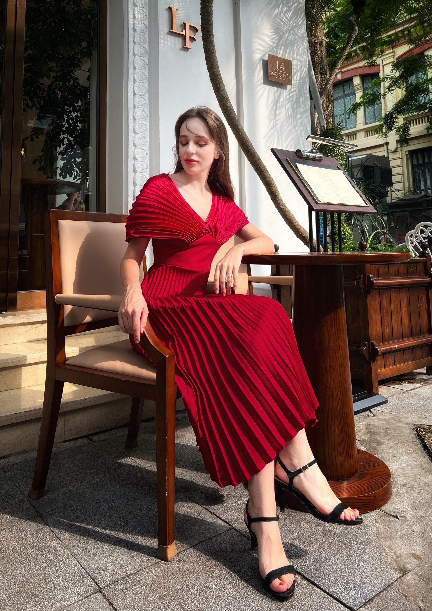 Pleated Maxi Dress, V Neckline Dress, Event Guest Dress, Formal Dre...