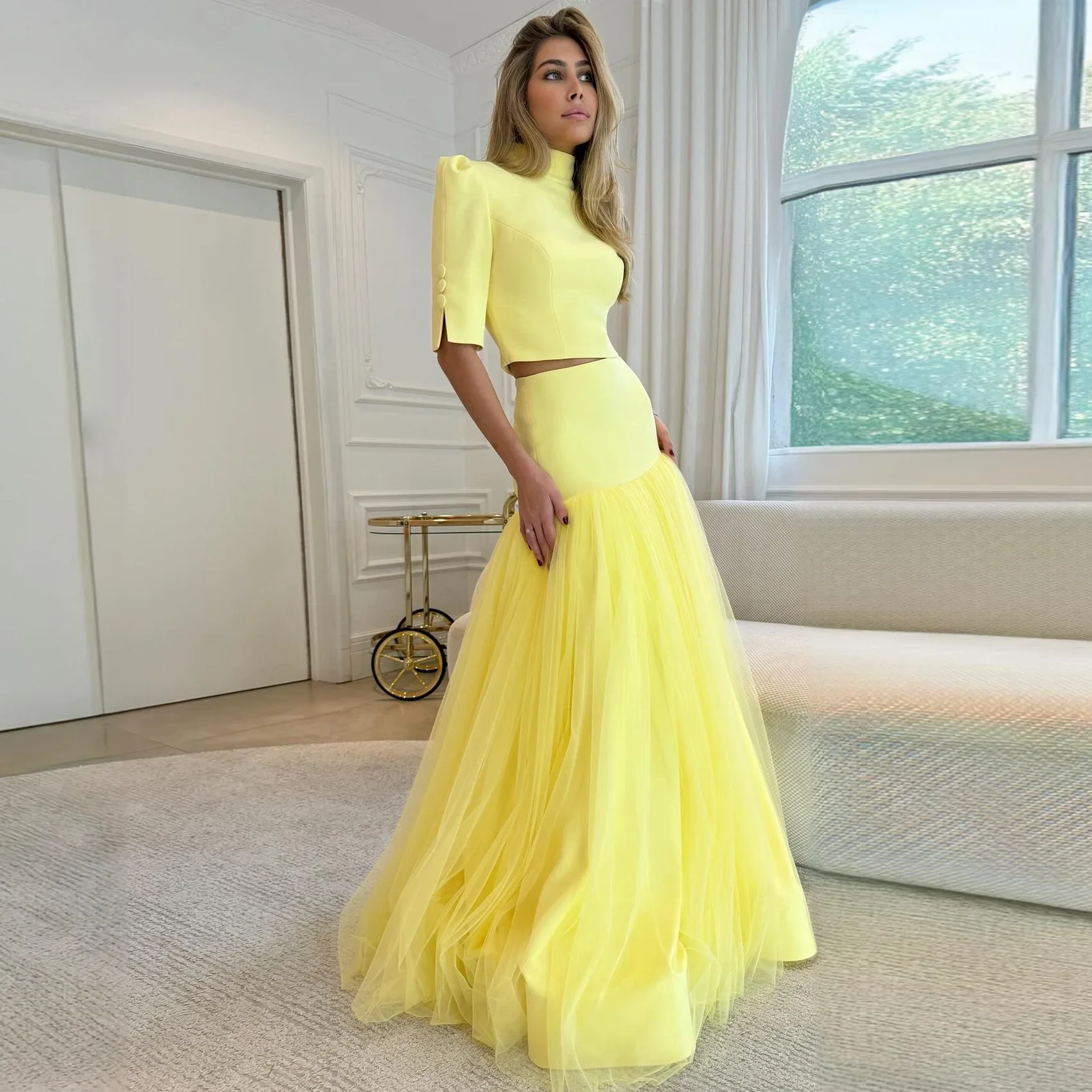 Pretty Yellow Two Pieces Party Dresses High Neck Stretchy Silk Tulle Women Formal Occasion Dress 2 P...