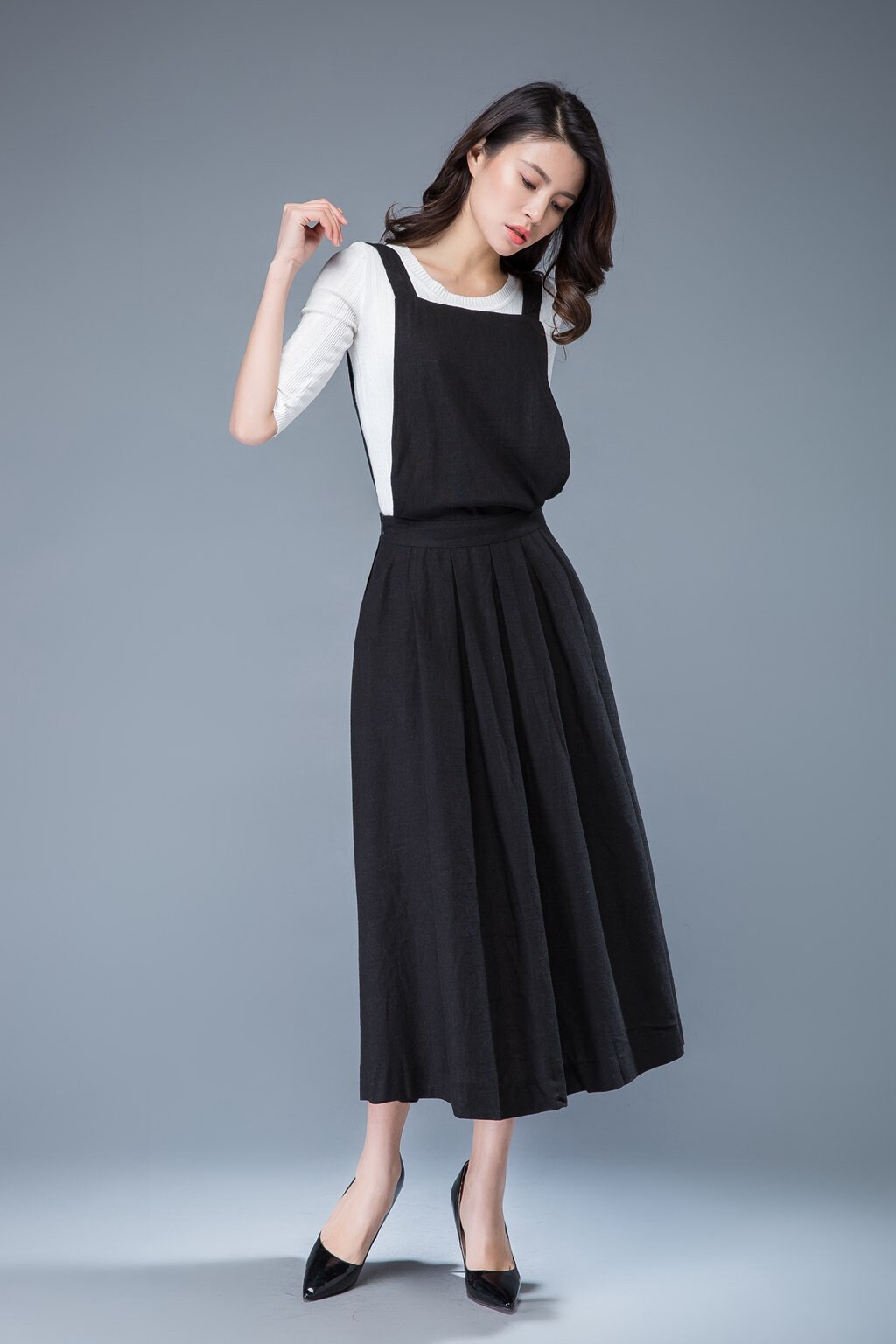Black Linen Pinafore Dress - Sleeveless A-Line Apron Midi Dress wit...
