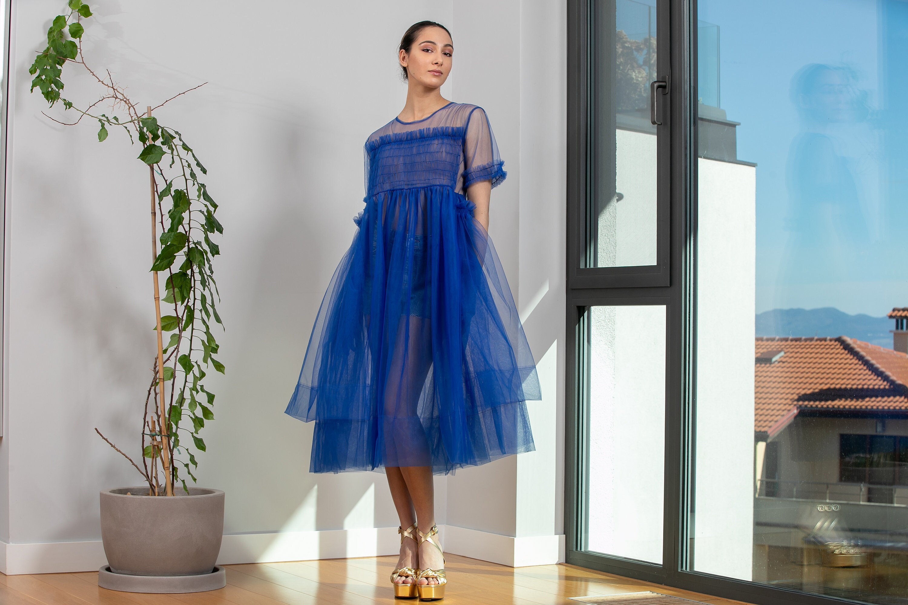 Introducing our stunning tulle midi dress with ruffles! This ethereal beauty of our royal blue bride...