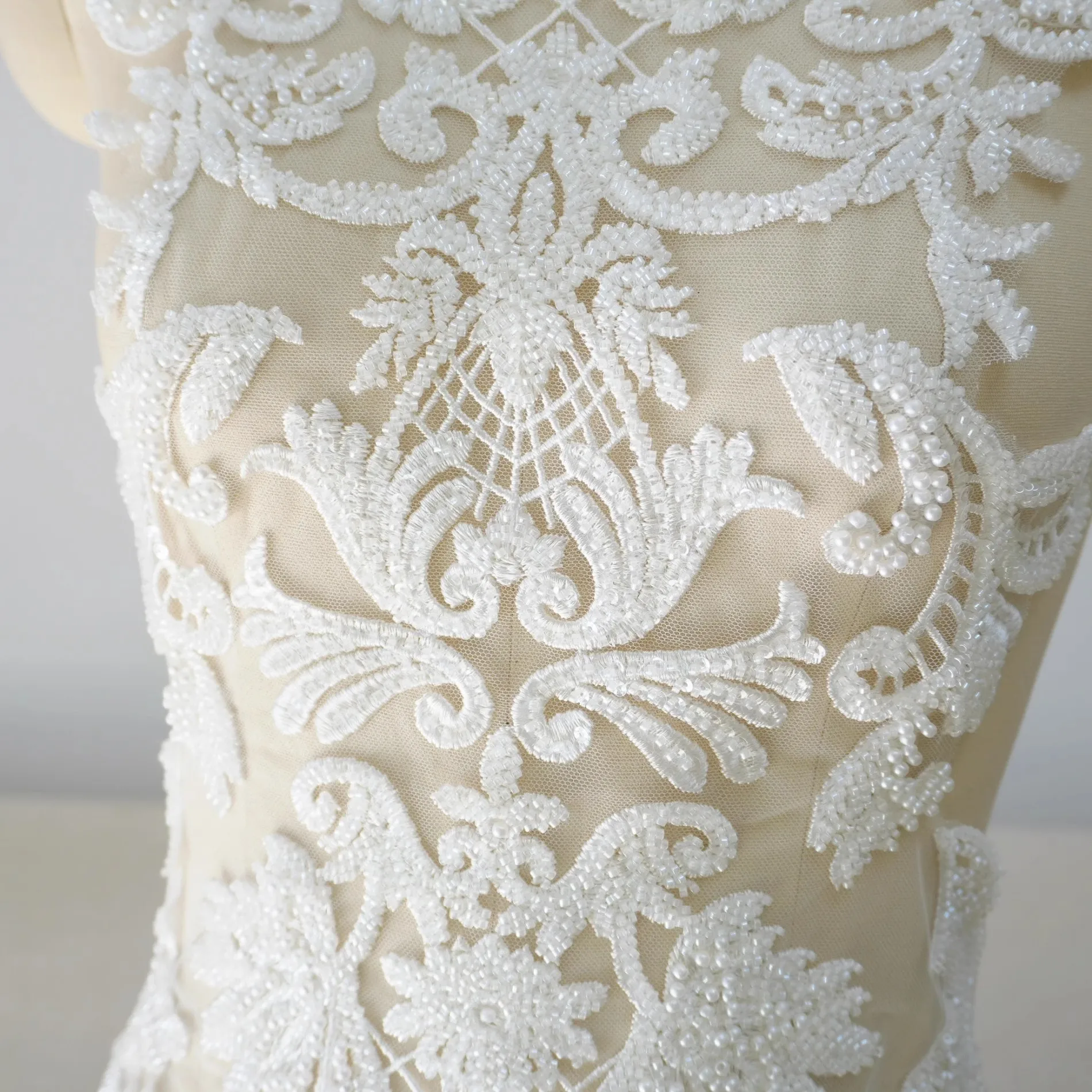 "luxurious hand embroidery with heavy beading and applique kosher fabric for wedding, bridal dr...