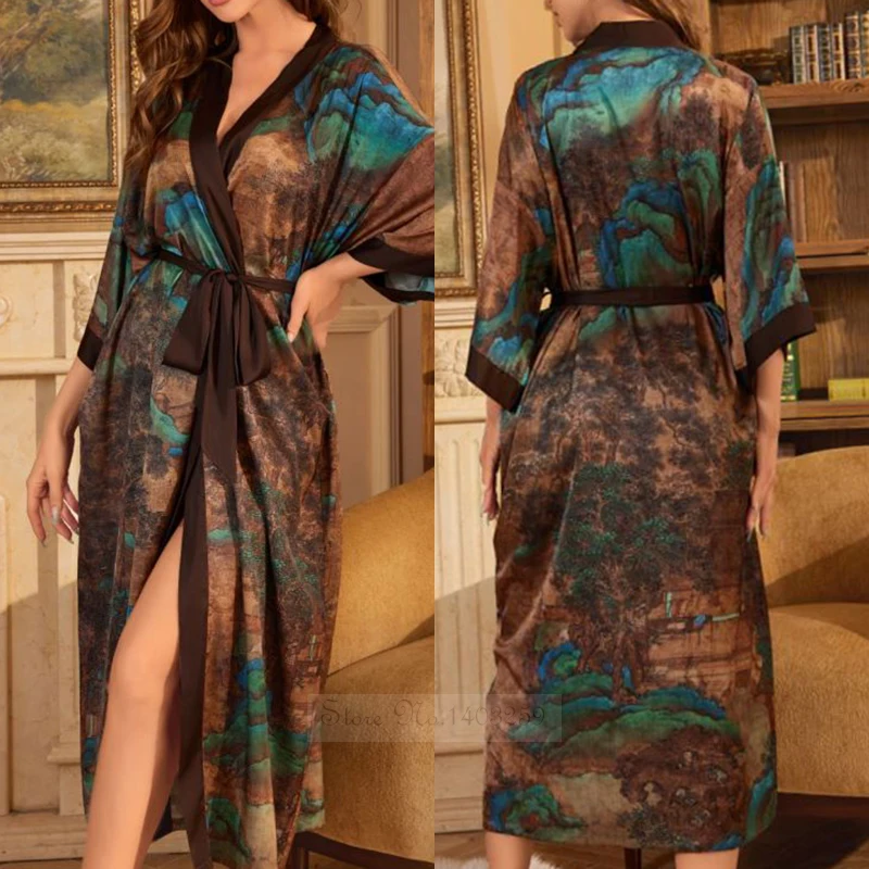Female Long Robe Nightgown Spring Summer Half Kimono Bathrobe Gown Print Sleepwear Home Dressing Gow...