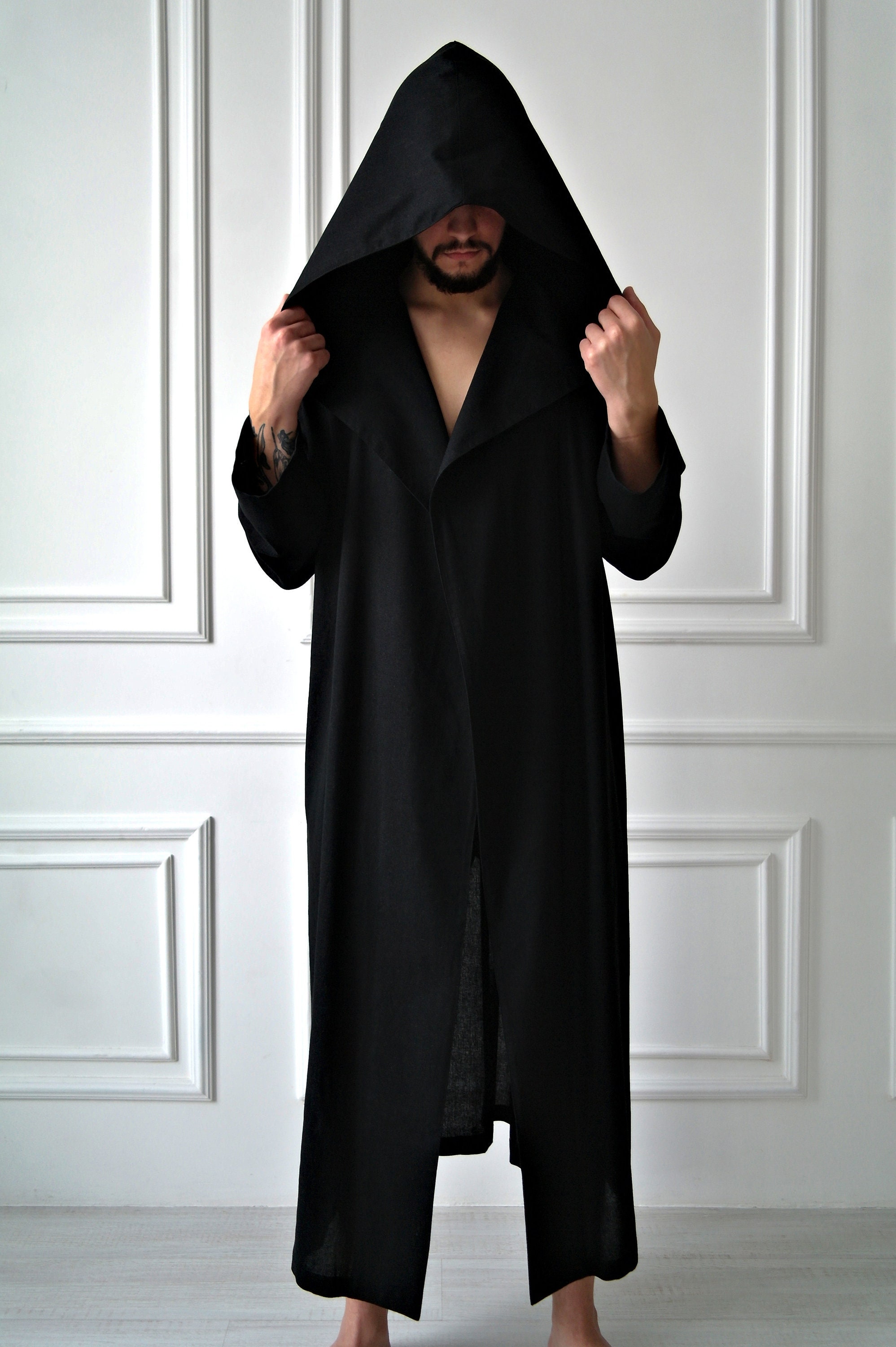 Men's linen robe, Black robe for men, Hooded linen robe, Black Hood...