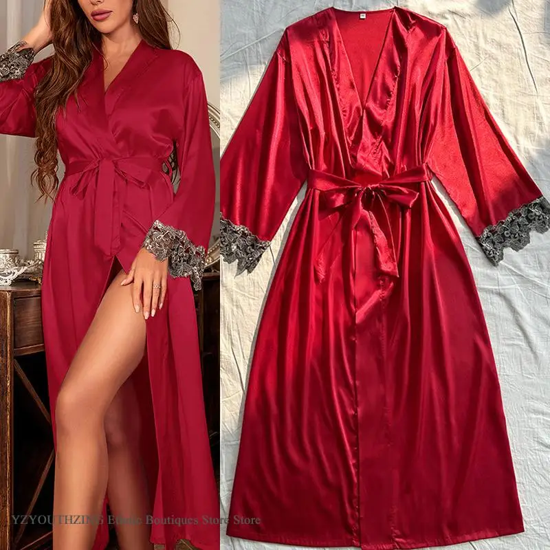 Bride Wedding Robe Dressing Gown Sexy Lace Sleepwear Nightgown Satin Long Kimono Bathrobe Gown Loose...