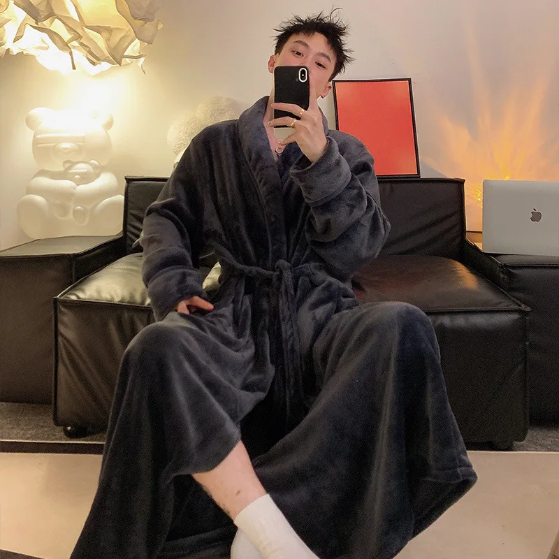 Large Size 150kg Men's Bathrobe Pajamas Winter Thickened Collar Fleece Long Hotel Nightgown Shawl Sl...