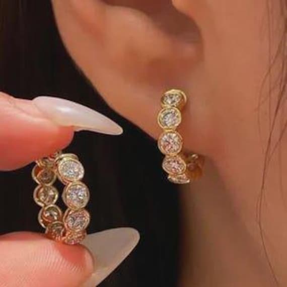 Bezel Set Diamond Hoop Earring, Round Cut Moissanite Diamond Hoop Earring, Stud Hoop Diamond Hoop, 9...