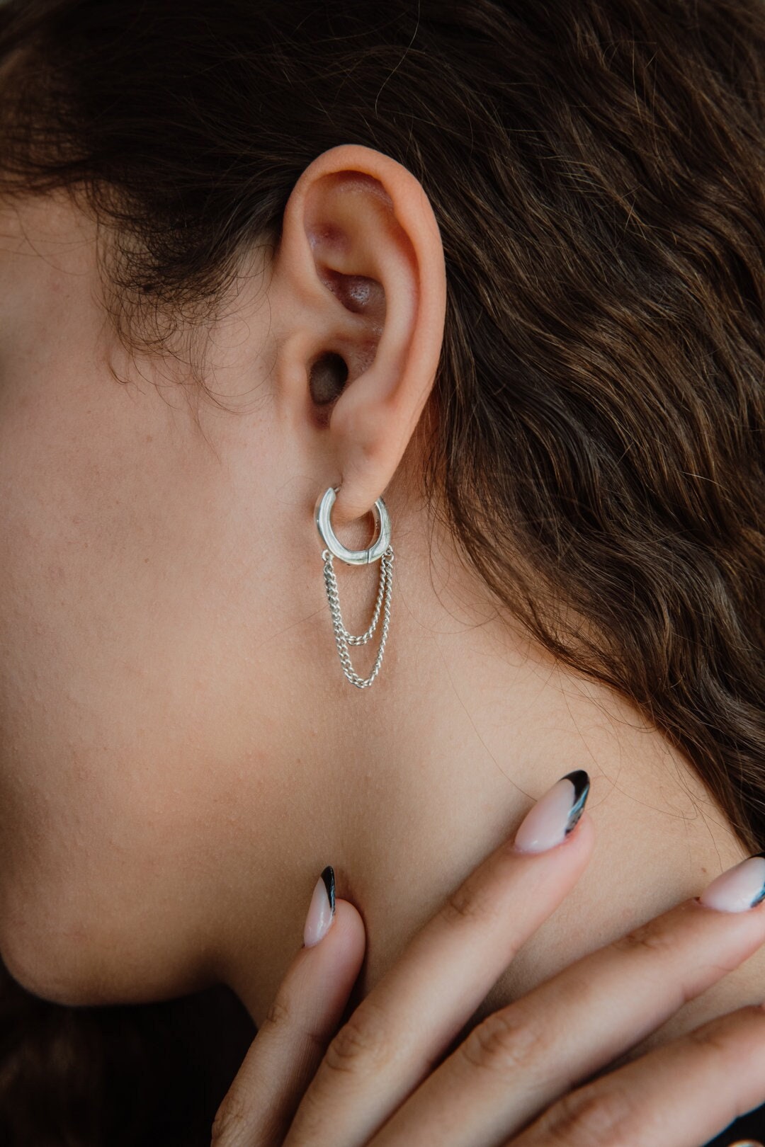 Chained Silver Hoop Earrings/ Huggie Hoops Double Chains/ Hoop Chai...