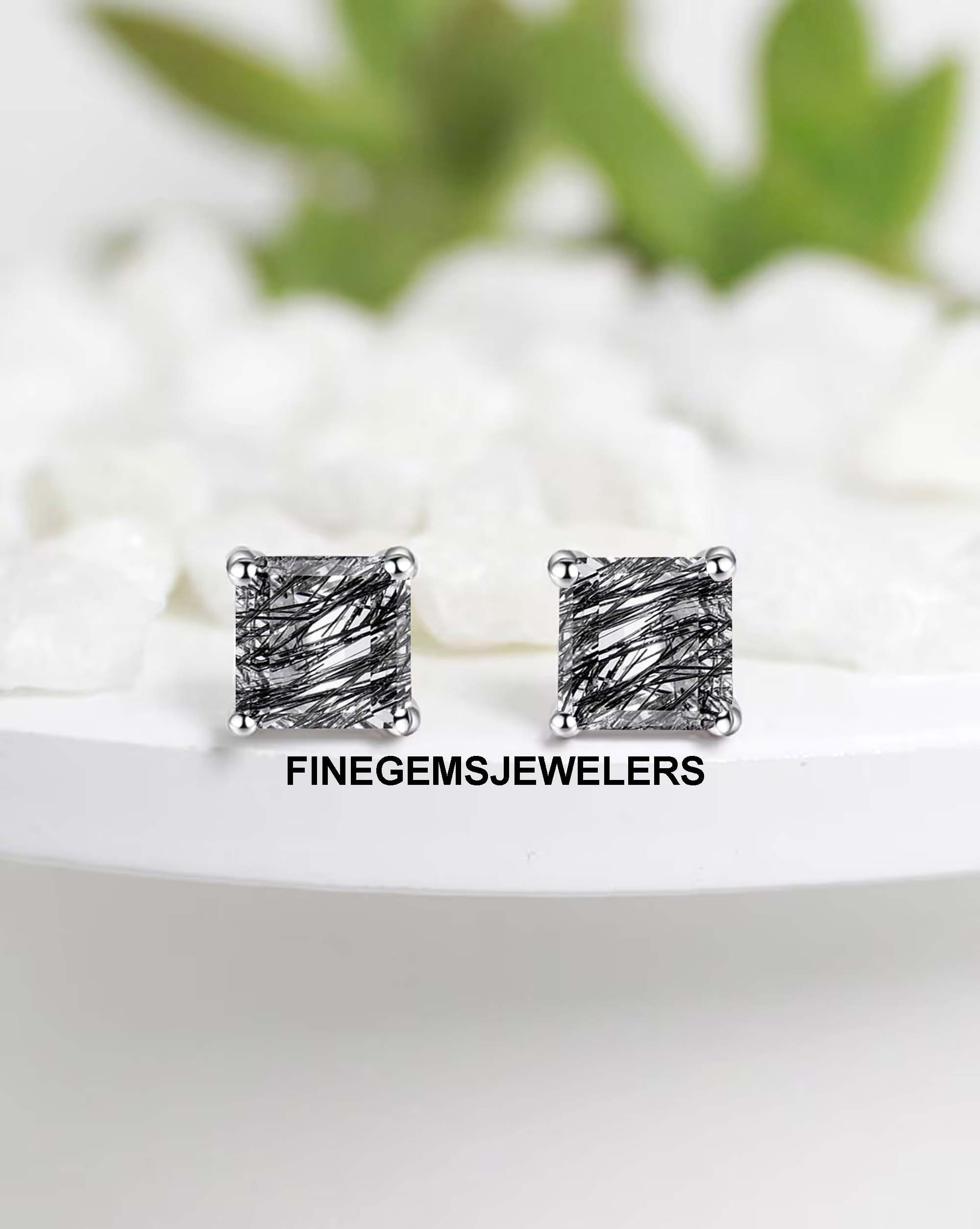 Black Rutile Studs Earrings, Crystal Quartz Square 5 To 10 mm Earri...