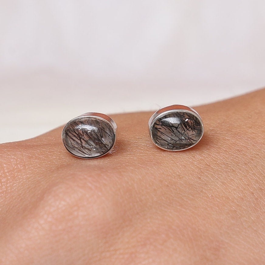Black Rutile Quartz Stud Earrings / 925 Sterling Silver Earrings / ...