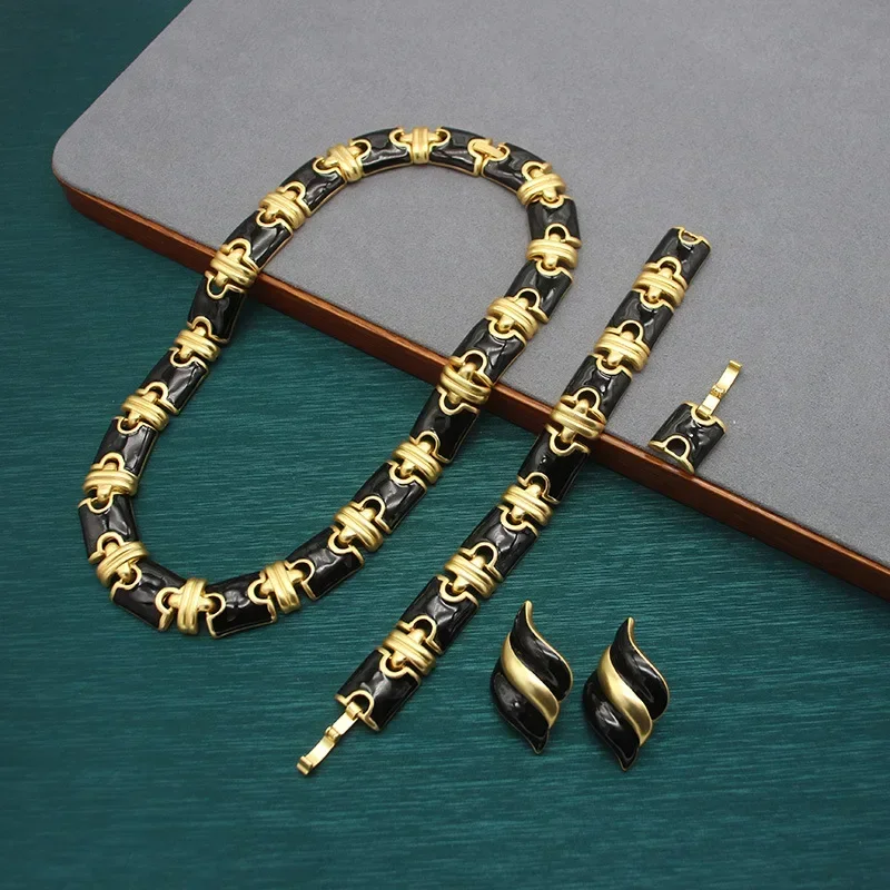 European and American Retro Black Gold Enamel Necklace Earring Bracelet Set Necklace Bracelet Ear Cl...