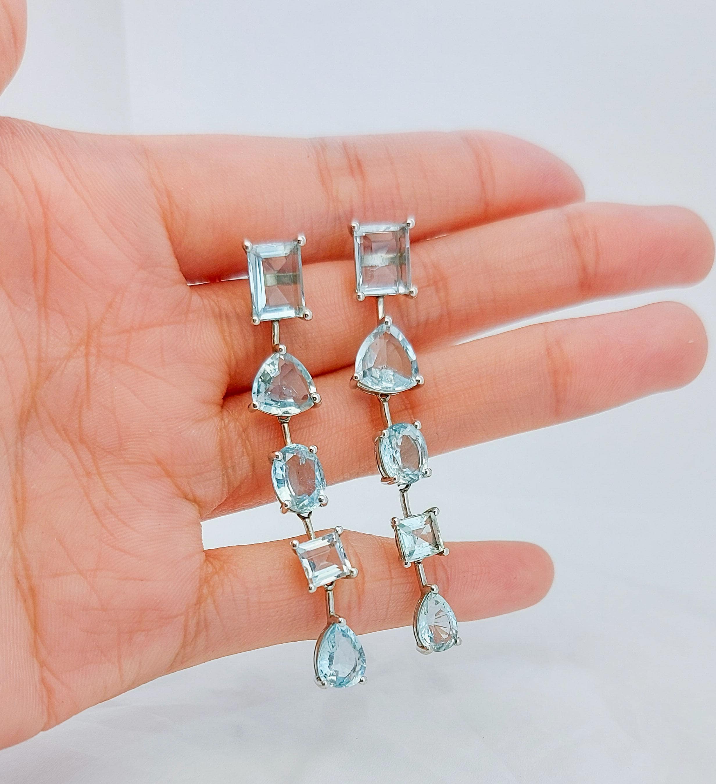 A square aquamarine gemstone in a pastel blue adorns the earrings and gives it plenty of elegance. T...