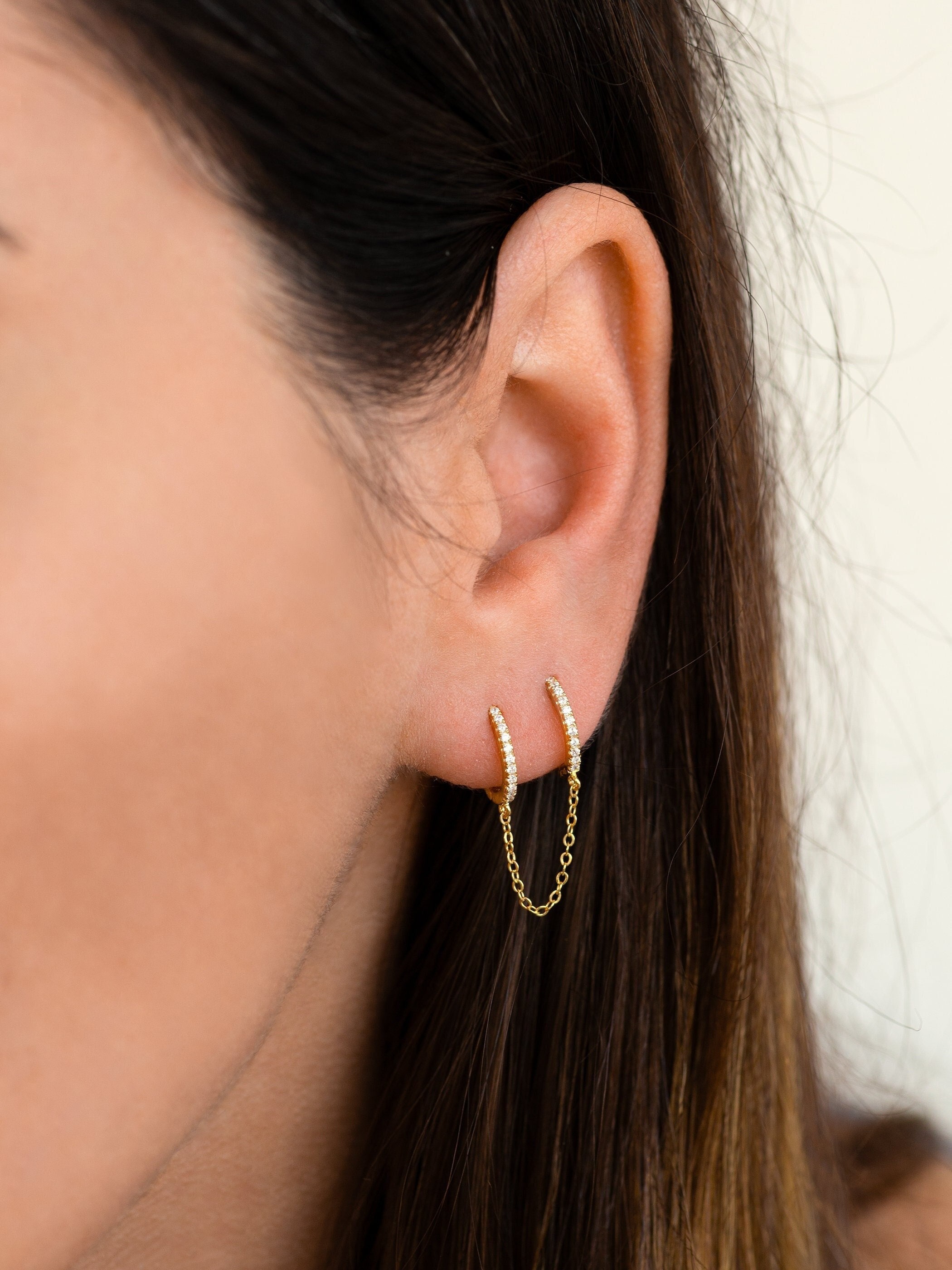 "Two dainty huggie hoops are connected by a delicate chain in this double piercing earring. Bea...