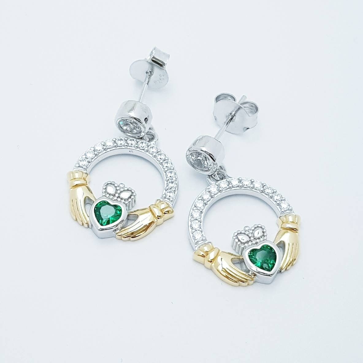 Emerald green claddagh Earrings, Silver and yellow gold Claddagh Ea...