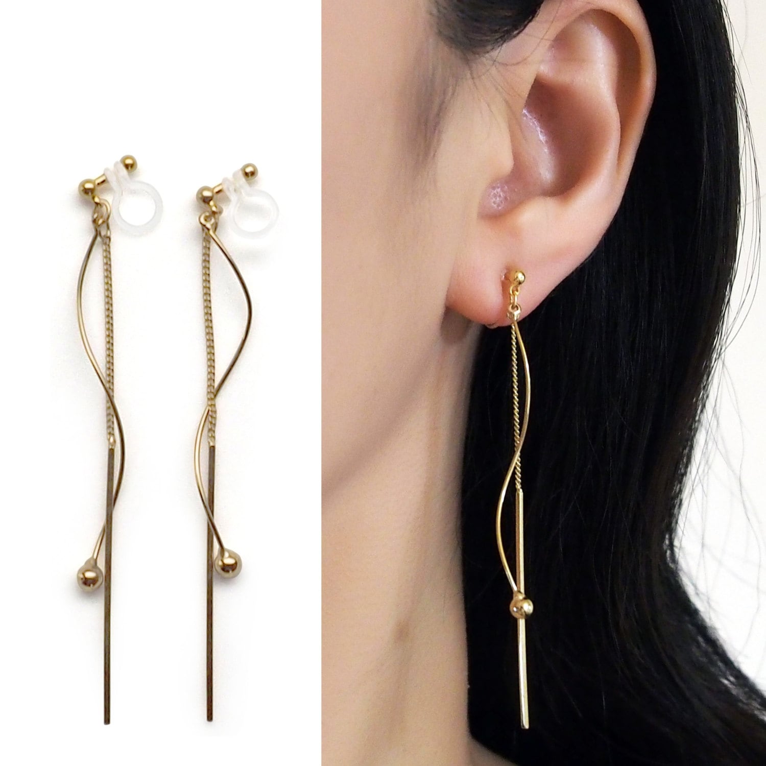 Gold clip on earrings,dangle wave bar invisible clip on earrings,go...