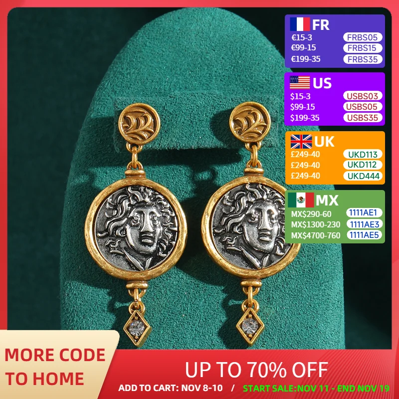 Vintage Woman Gold Color Crystal Drop Dangle Earrings Carving Head Coin Antique Jewelry Luxury Desig...