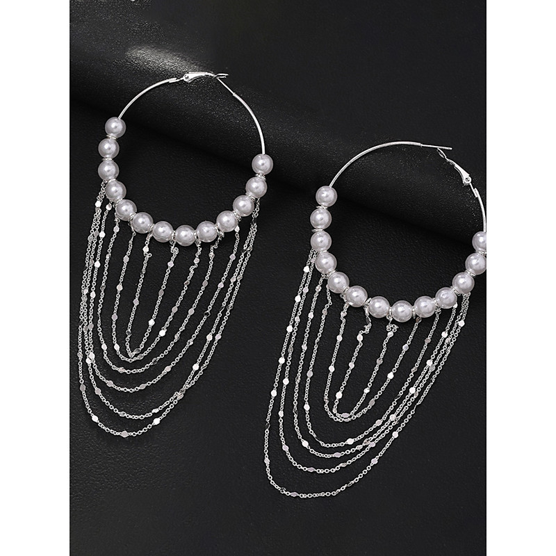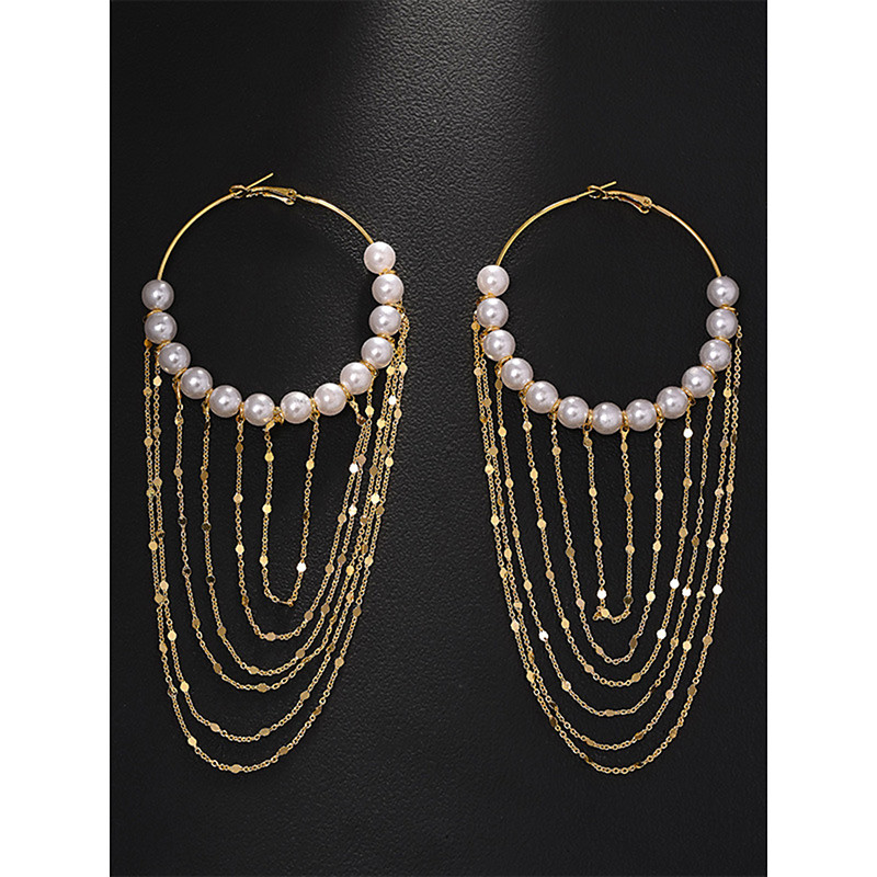 Women's Large Pearl Hoop Earrings with Layered Gold Chains - Statem...