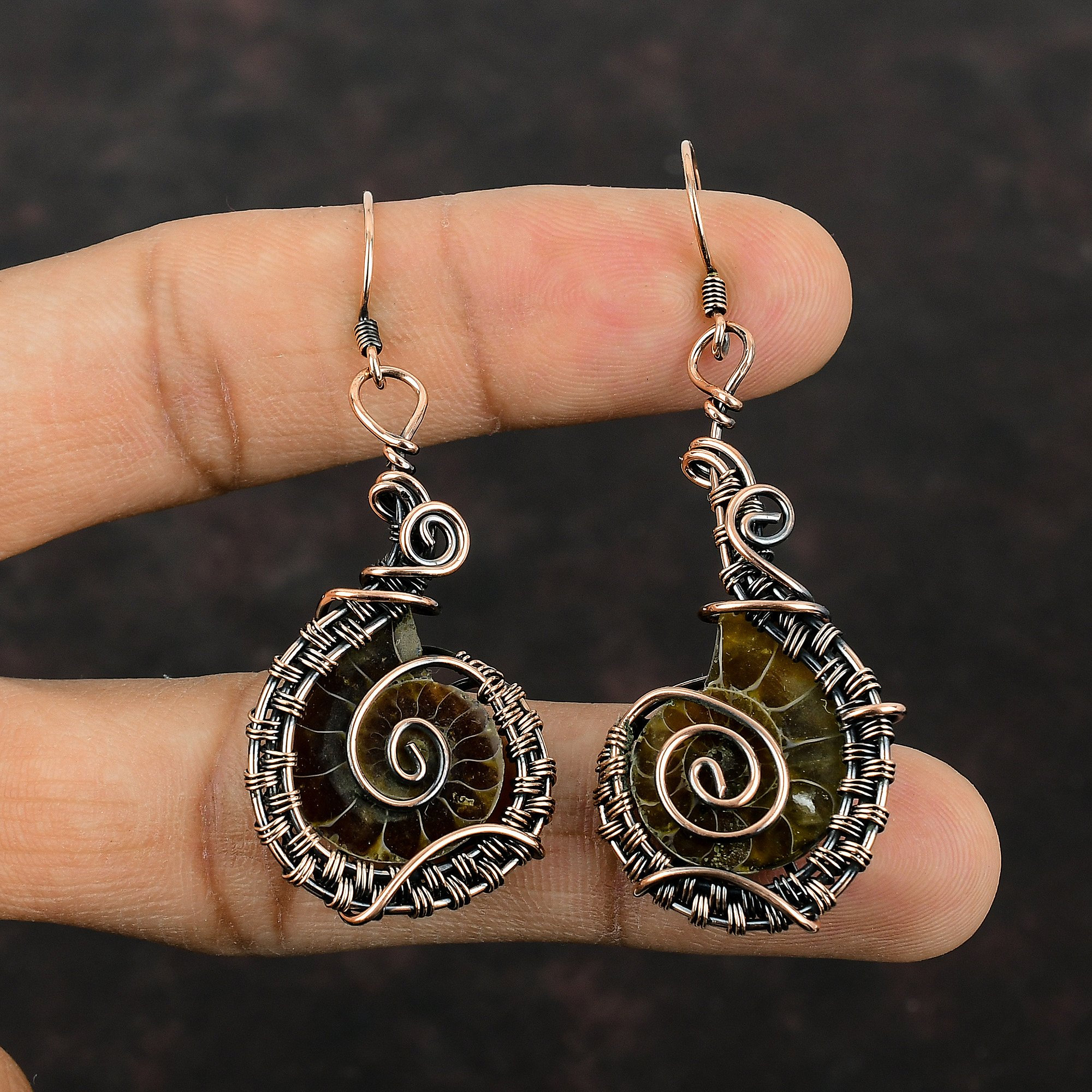 Ammonite Fossil Earrings Copper Wire Wrapped Earrings Gemstone Copp...