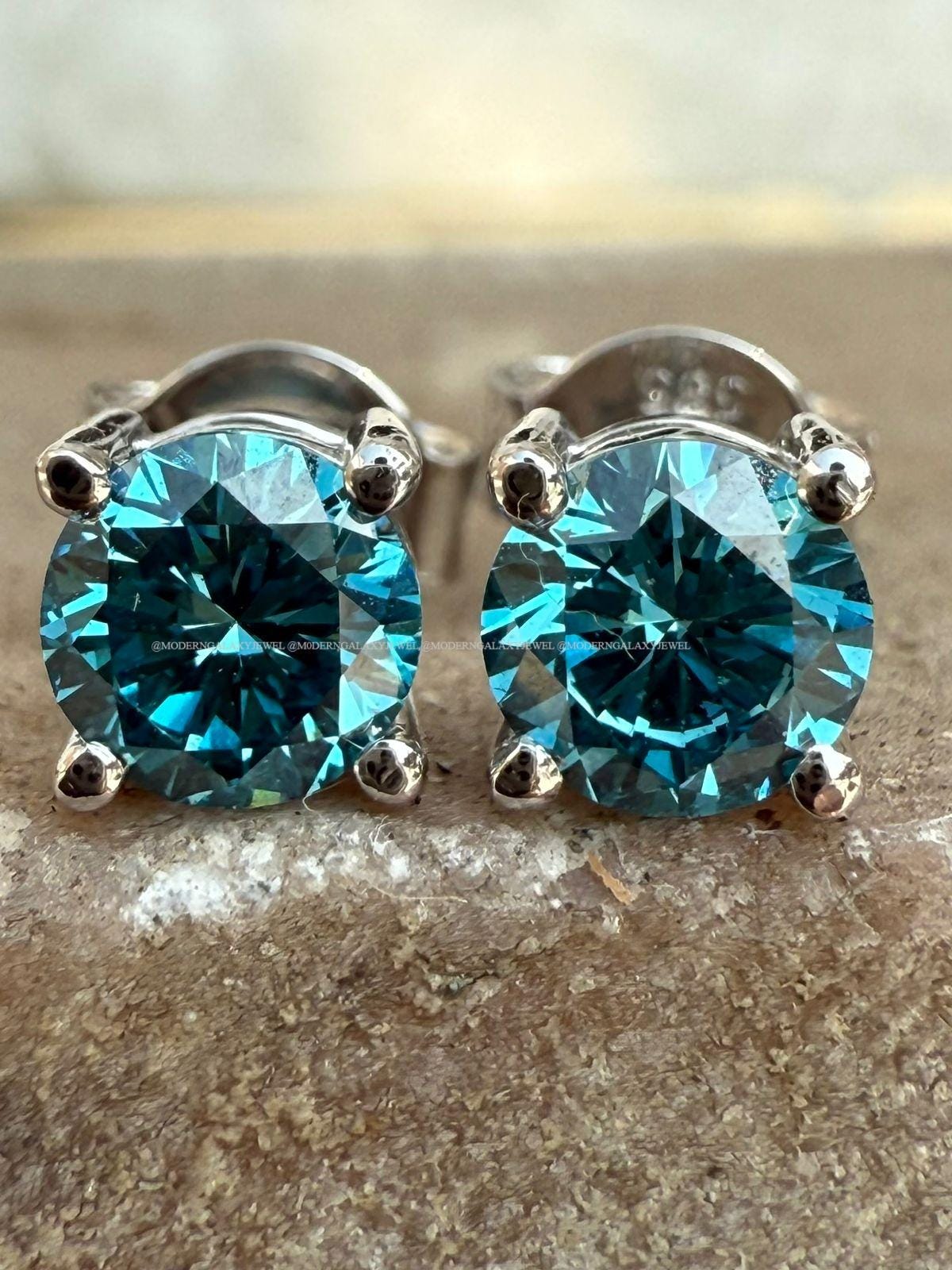 Blue Diamond Stud Earrings, Round cut Lab Grown Diamond Earrings, R...