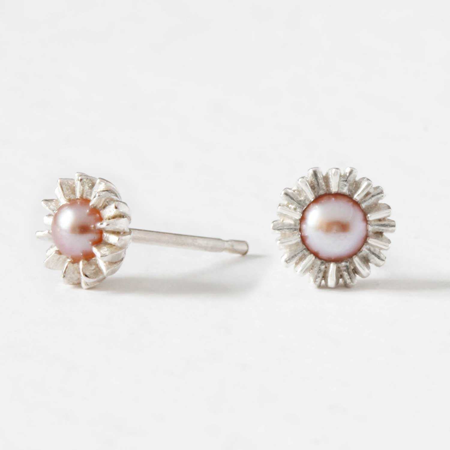 Dahlia Bud Peacock Pearl Earrings - Silver. Pearl studs, pink pearl studs, stud earrings, flower ear...
