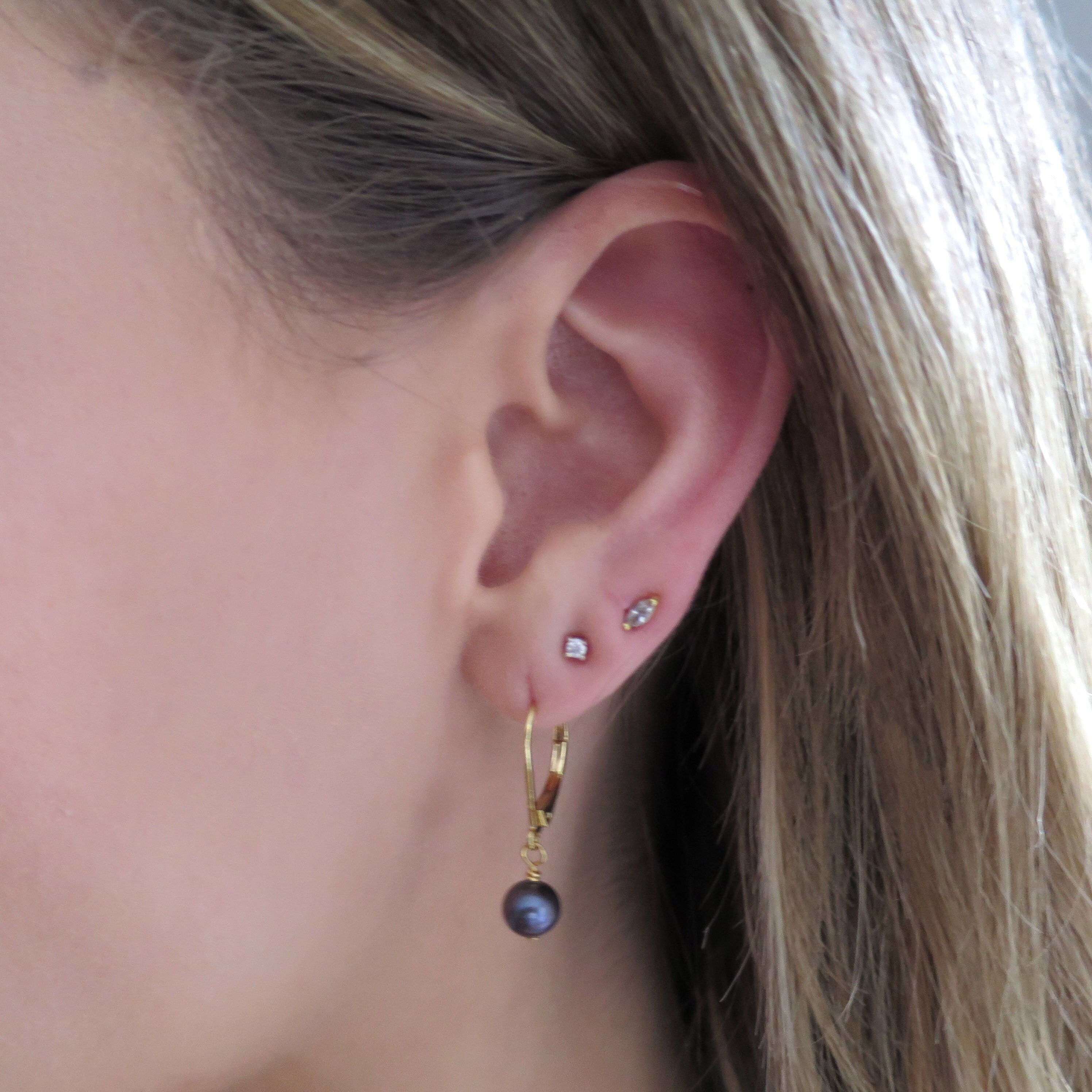 These dainty little earrings feature a genuine black pearl hung on a gold lever back ear hook. They'...
