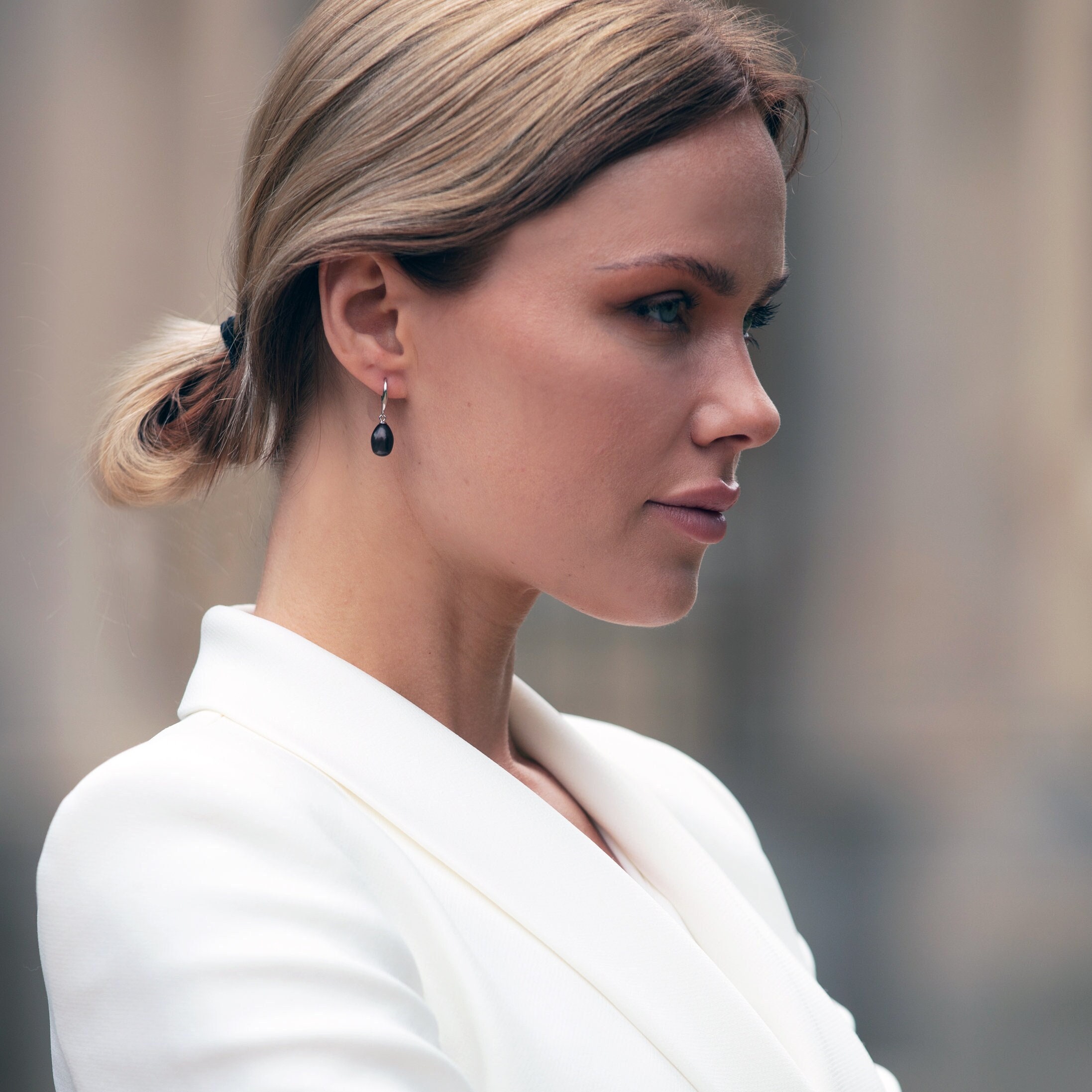 These stunning black freshwater pearl drop earrings have a modern, understated design. The pearl is ...