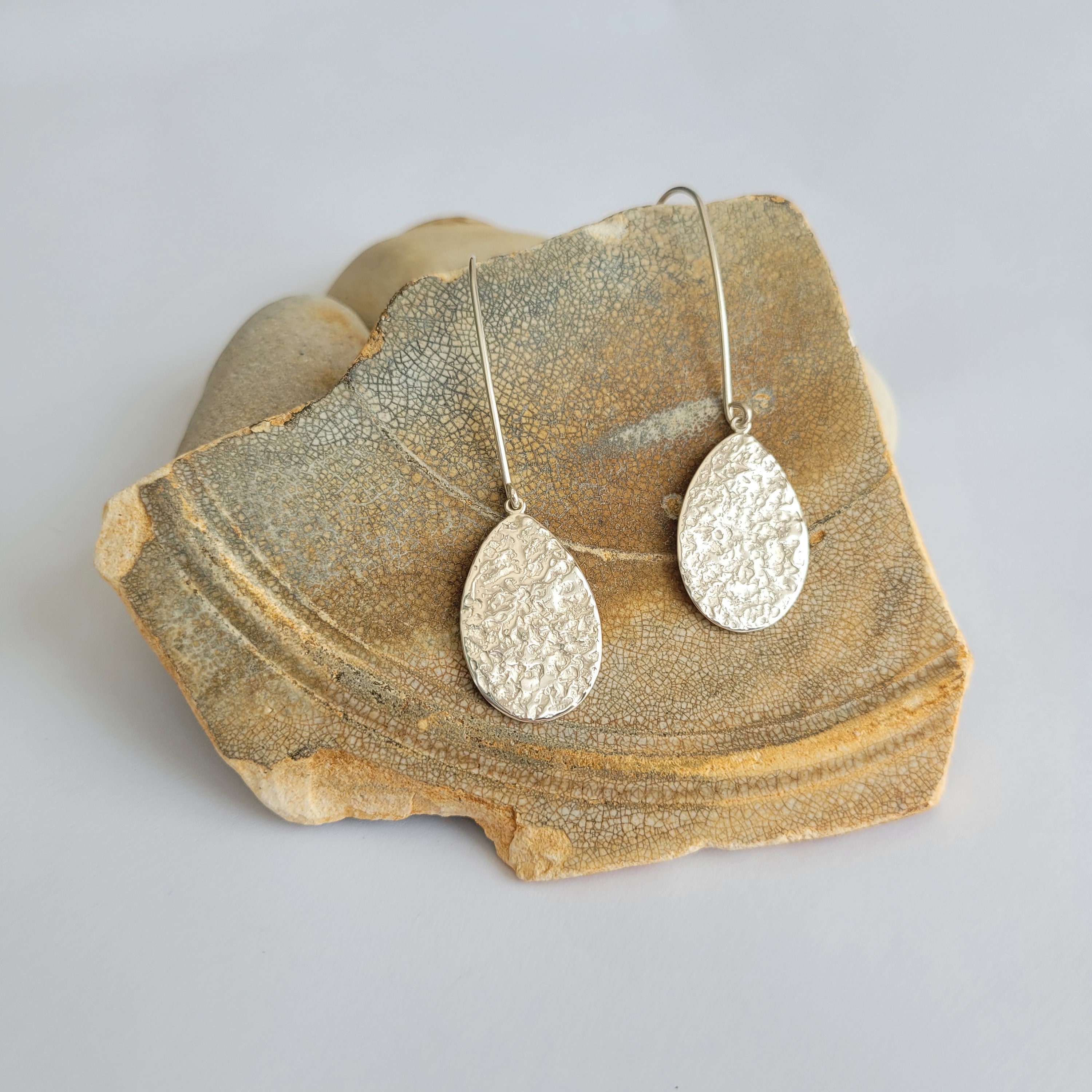 These dangle drop earrings have been handmade in recycled sterling silver. The shape and texture of ...