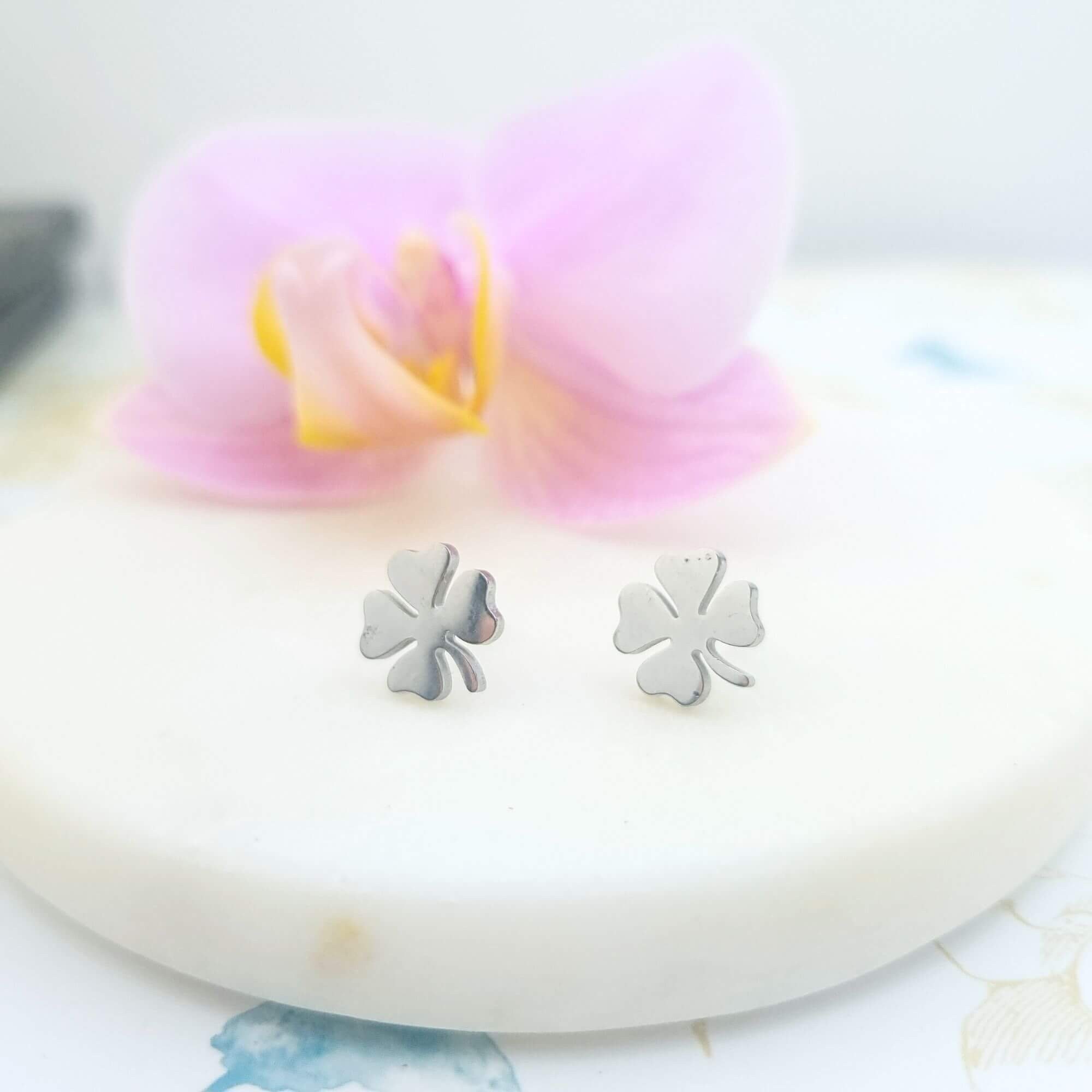 Four leaf clover stud earrings, tiny shamrock leaf studs, plant jew...