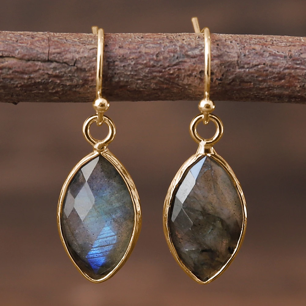 2pcs Natural stone faceted marquise labradorite edged leaf-shaped imperial stone pendant earrings