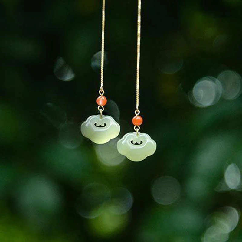 New design silver inlaid natural Hetian jasper long earrings classi...