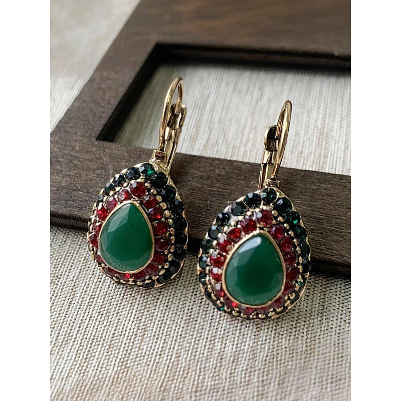 Women's Earrings Vintage Metal Green Stone Hoop Hook Hand Engraved ...