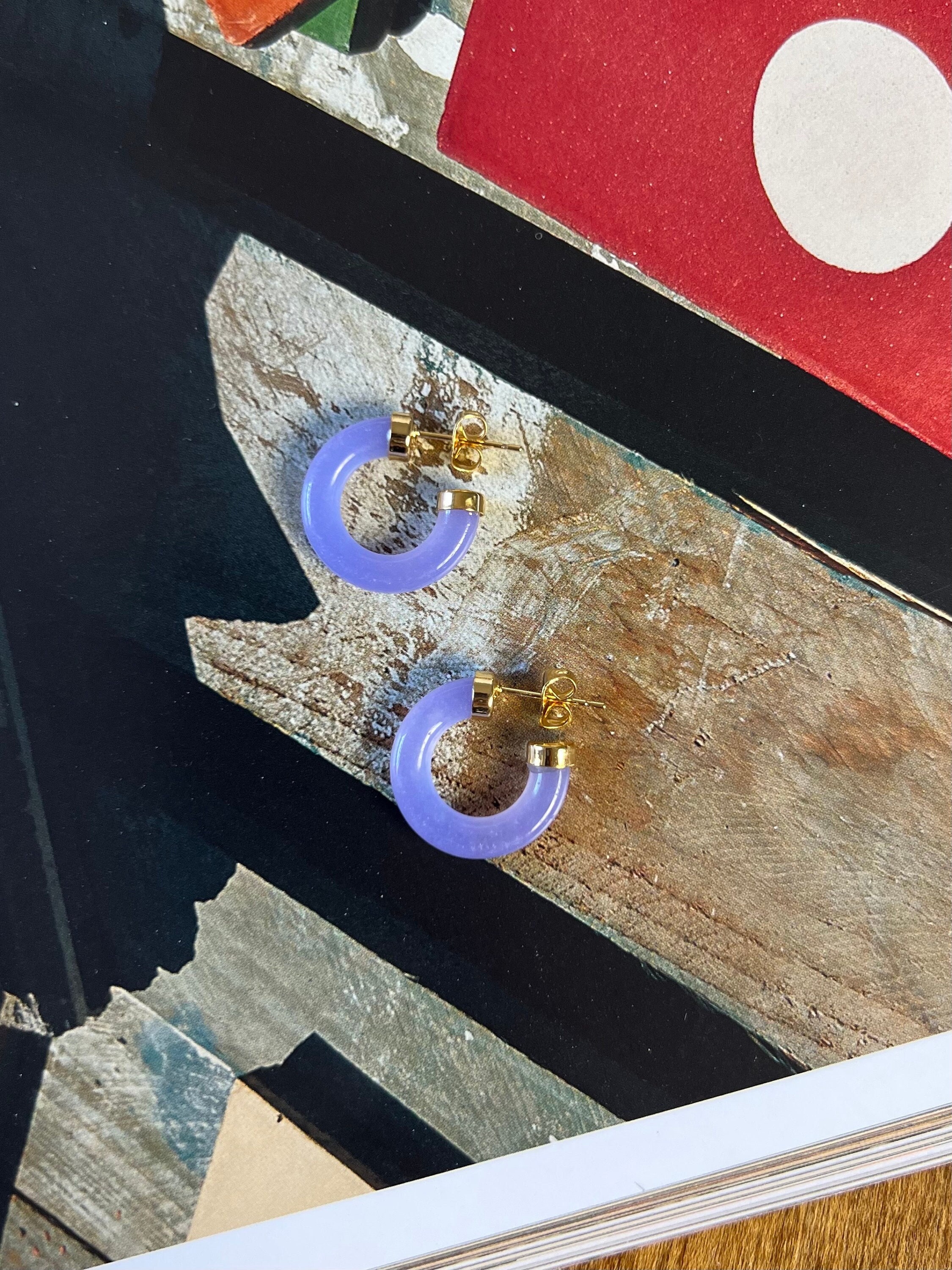Purple Lavender Jade Gold Hoop Earrings,18k Gold Jade Earrings , Pi...