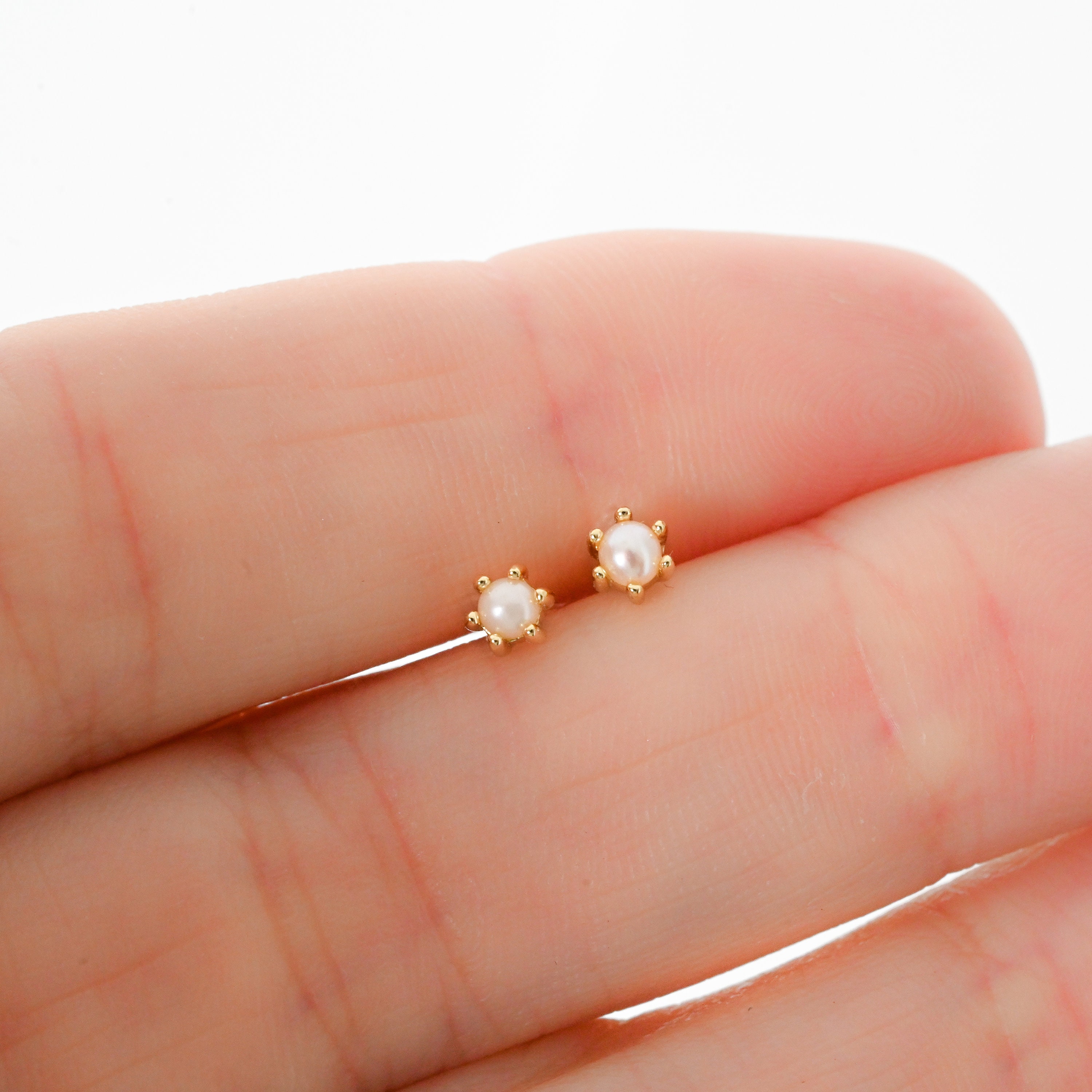 Sweet and dainty pearl stud earrings. They're small, perfect for multiple piercings! - - - D E T A I...